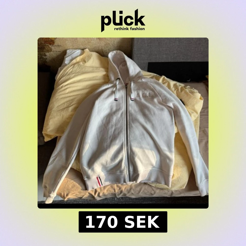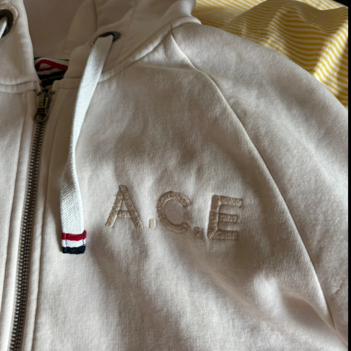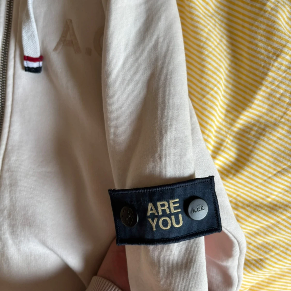 Vit hoodie från A.C.E med broderad logga på bröstet och coolt tygmärke på ärmen med texten 'ARE YOU'. Tröjan har hel dragkedja, huva med snörning och ribbade muddar. Snygga detaljer i rött, vitt och blått på snörena och nederkanten. Perfekt för en chill och stilren look. Jag är lite osäker på storleken på tröjan men den är en S eller M men den passar som både och.