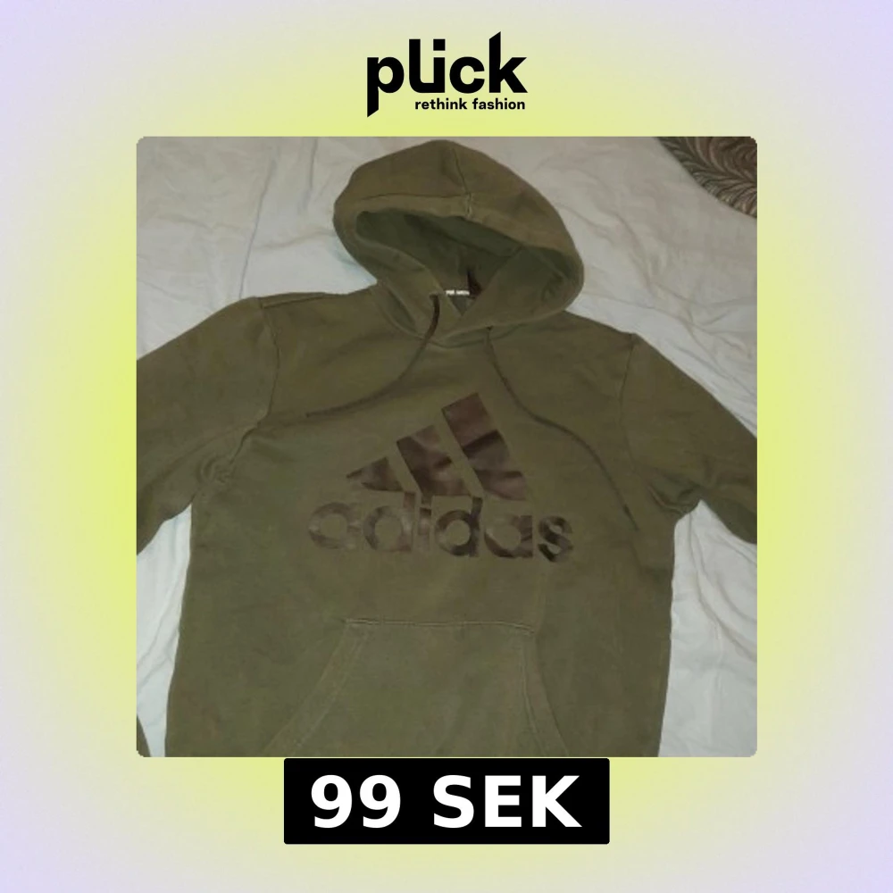 Säljer en olivgrön hoodie från Adidas med stor logga på framsidan. Tröjan har en klassisk känguruficka och huva. Perfekt för en avslappnad stil. Storlek S passar dig runt 160cm perfekt