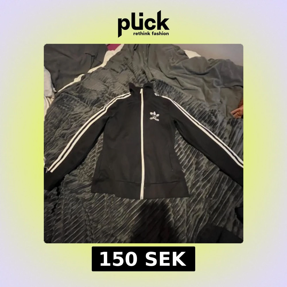 Säljer en svart träningsjacka från Adidas med vita ränder längs ärmarna och dragkedja framtill. Jackan har Adidas-loggan på bröstet och praktiska fickor med dragkedja. Perfekt för sportiga aktiviteter eller en avslappnad stil.
