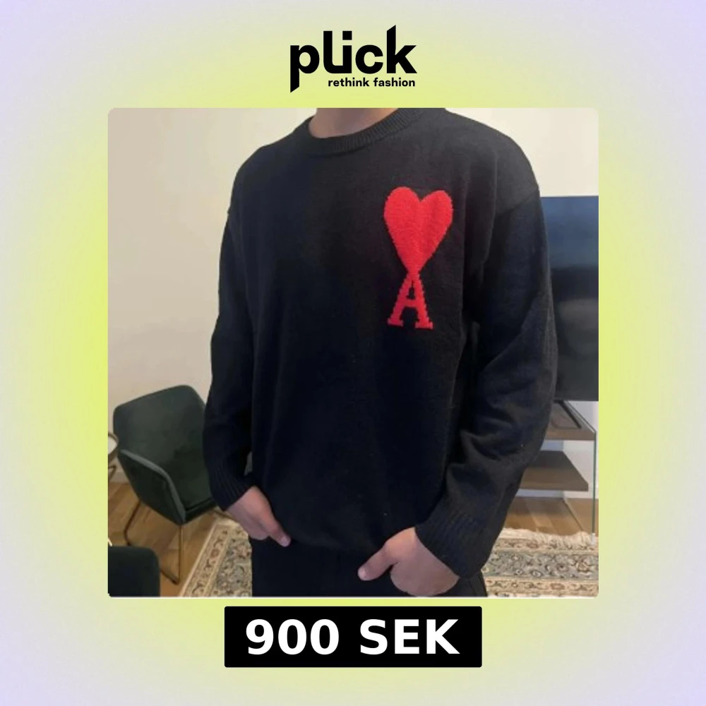 Säljer en snygg stickad tröja från Ami Paris med deras ikoniska röda hjärta och A på bröstet. Finns i både svart och vitt. Tröjan har rund halsringning, långa ärmar och ribbade muddar. Perfekt för dig som vill ha en stilren men ändå unik look.