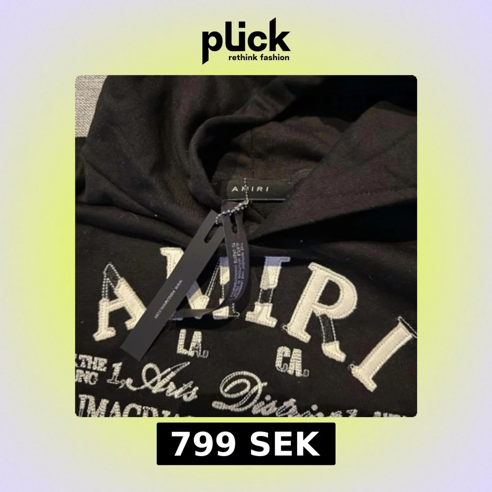 Svart hoodie från Amiri med logga - Svart hoodie från Amiri i 100% bomull med stor AMIRI-logga framtill och en mindre logga på ärmen. Klassisk huva utan snören, perfekt för en streetwear-look. Snygg och stilren design med en lite loose passform. Storlek M. Har ni några frågor så är det bara att fråga! Priset är inte hugget i sten.