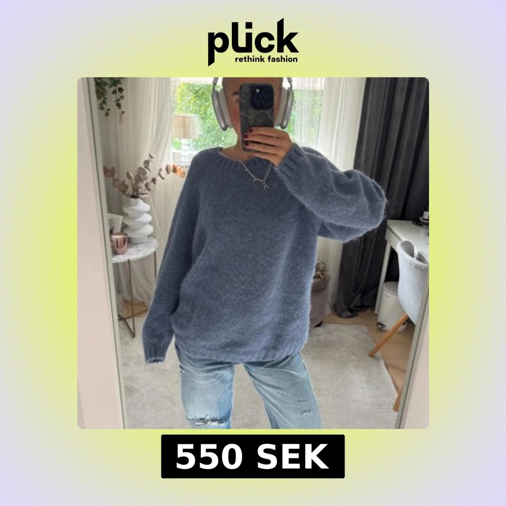 Mysig blå stickad tröja i mohair med rund halsringning och långa ärmar. Tröjan har en loose passform och är tillverkad i ett fluffigt material som känns supermjukt. Perfekt för lager-på-lager och chill dagar. Nypris 1400kr❣️(ompublicering, inte mina bilder)