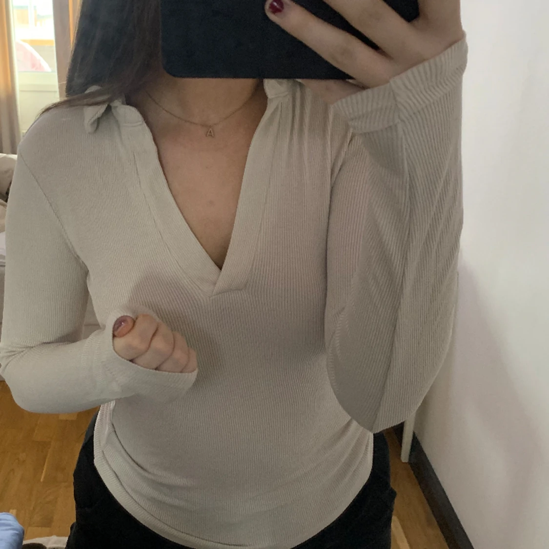 Säljer en beige jättefin v ringad tröja! (Säljer även samma fast i brun). Kommer inte till någon användning. Toppen skick 🤍🤍