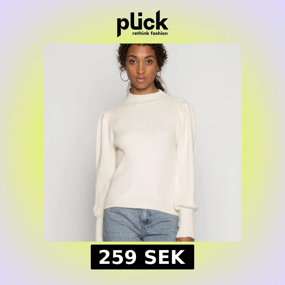 Säljer en krämvit ribbad tröja från ONLY i storlek XS. Tröjan har långa ärmar och en hög krage, perfekt för kyligare dagar.