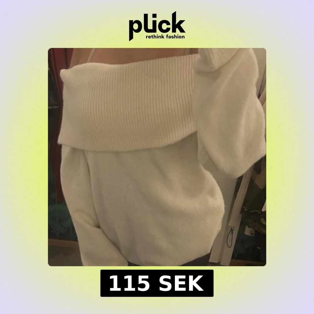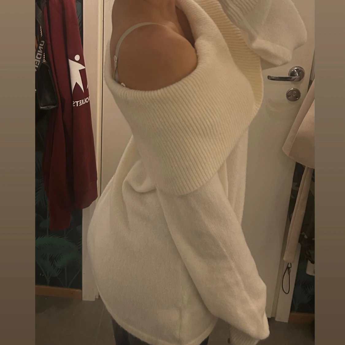 Superfin vit stickad tröja med bred offshoulder-krage och långa ärmar. Tröjan har en oversized och loose passform. Använd endast en gång.
