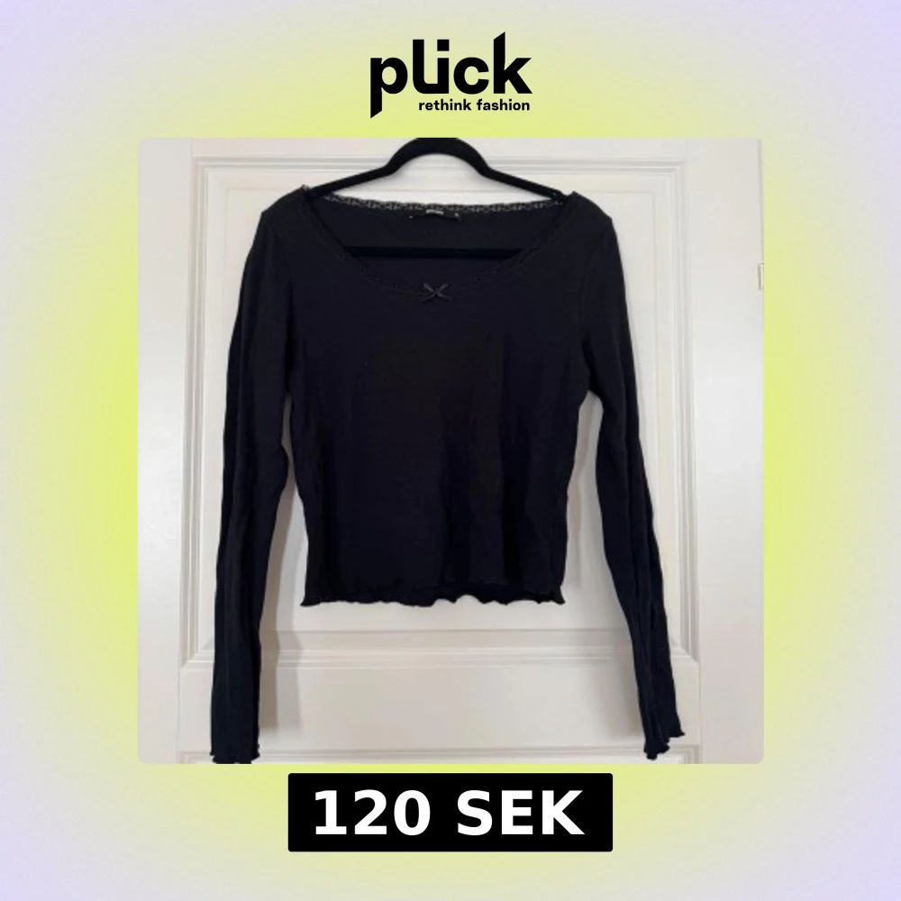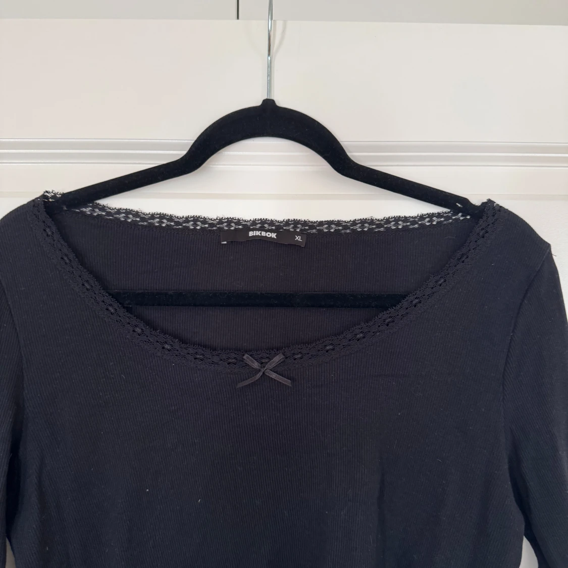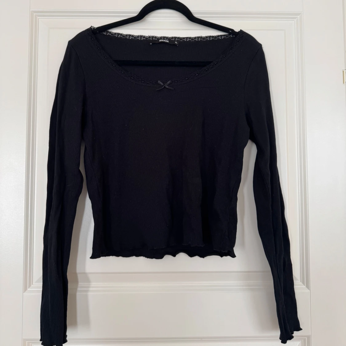 Svart långärmad topp från BikBok med ribbad struktur, söt liten rosett framtill och spetskant runt den breda urringningen. Modellen är figurnära och har vågig kant nertill för en extra detalj. Perfekt för dig som gillar en enkel men ändå söt stil.