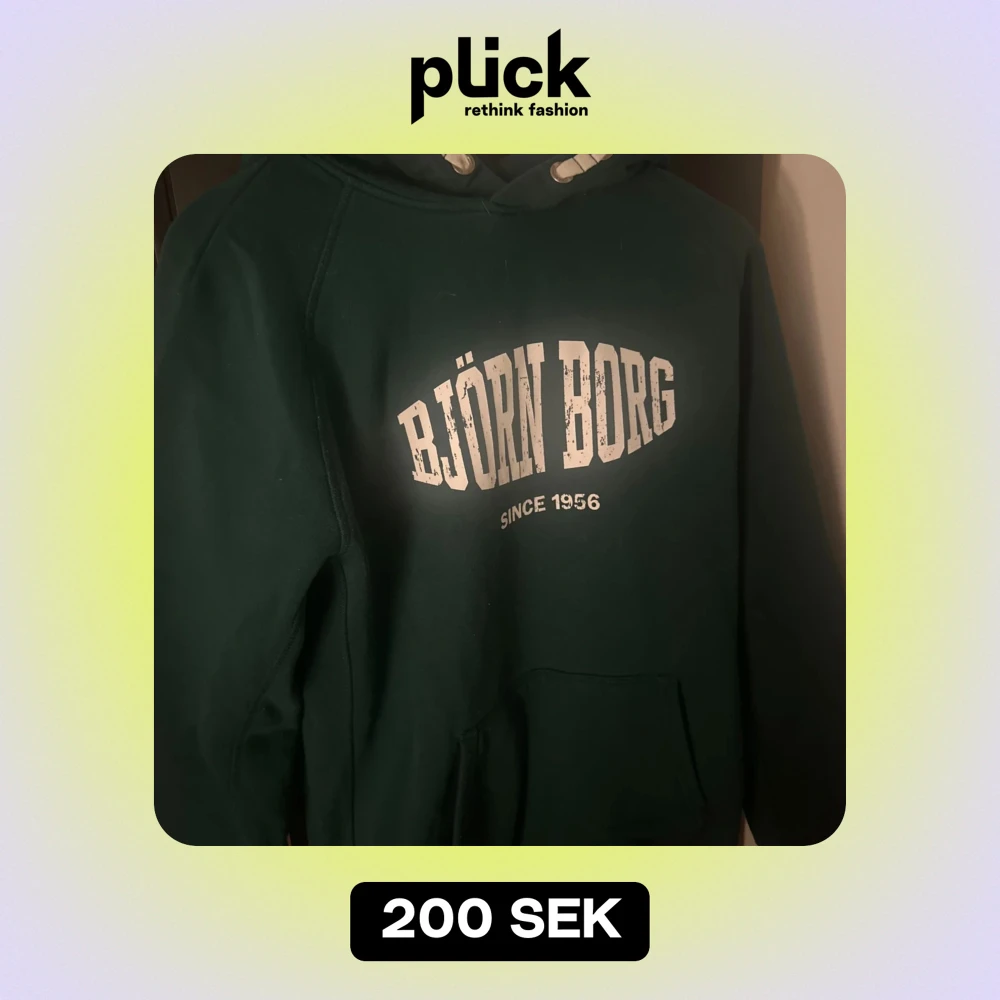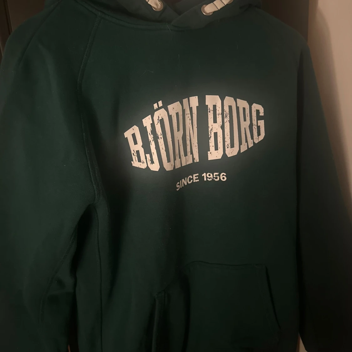 Säljer en snygg grön hoodie från Björn Borg med vit text på bröstet. Den har en klassisk känguruficka och justerbar huva med snören. Perfekt för en avslappnad stil eller träning. Passar bra till både jeans och träningsbyxor!