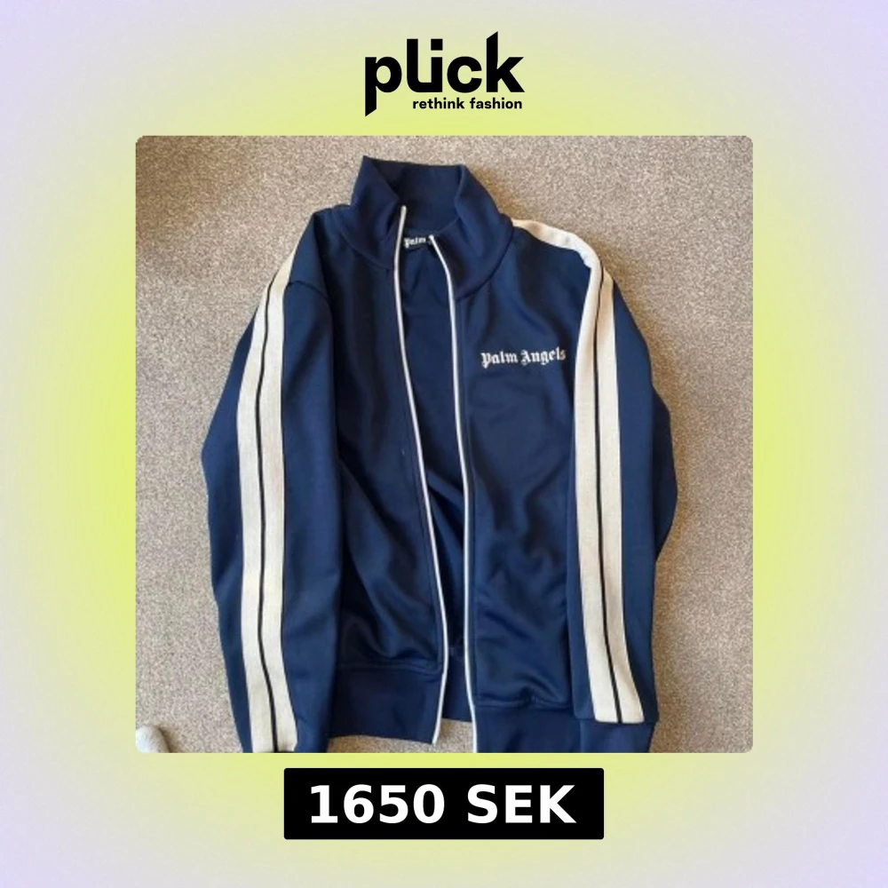 Säljer en snygg marinblå track jacket från Palm Angels med vita ränder längs ärmarna och logga på bröstet. Jackan har hög krage, dragkedja framtill och sportig vibe. Perfekt för dig som gillar streetwear och vill sticka ut.