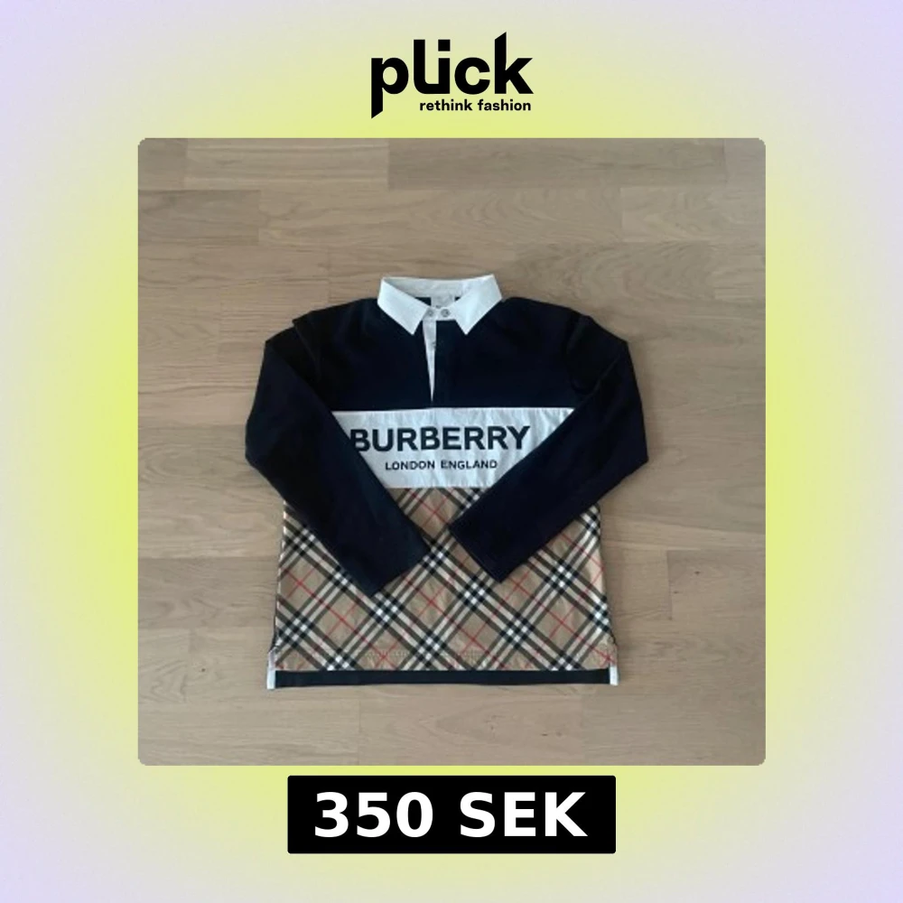 Säljer en snygg pikétröja från Burberry med vit krage, svarta ärmar och överdel samt klassiskt beige rutmönster nertill. Stor logga framtill och knäppning vid halsen. Perfekt för dig som gillar stilrena märkeskläder.