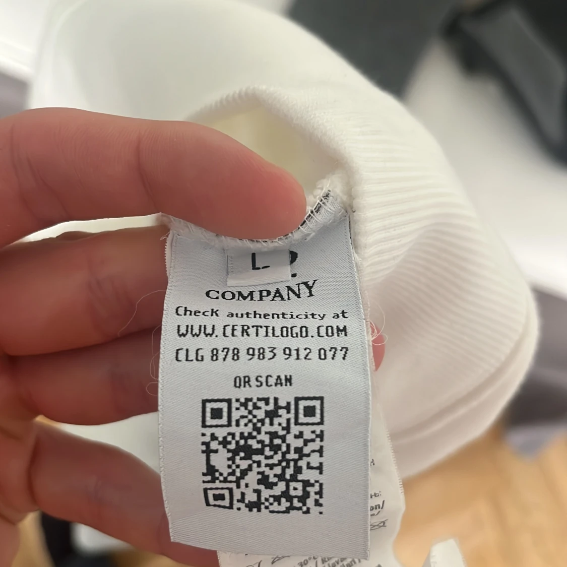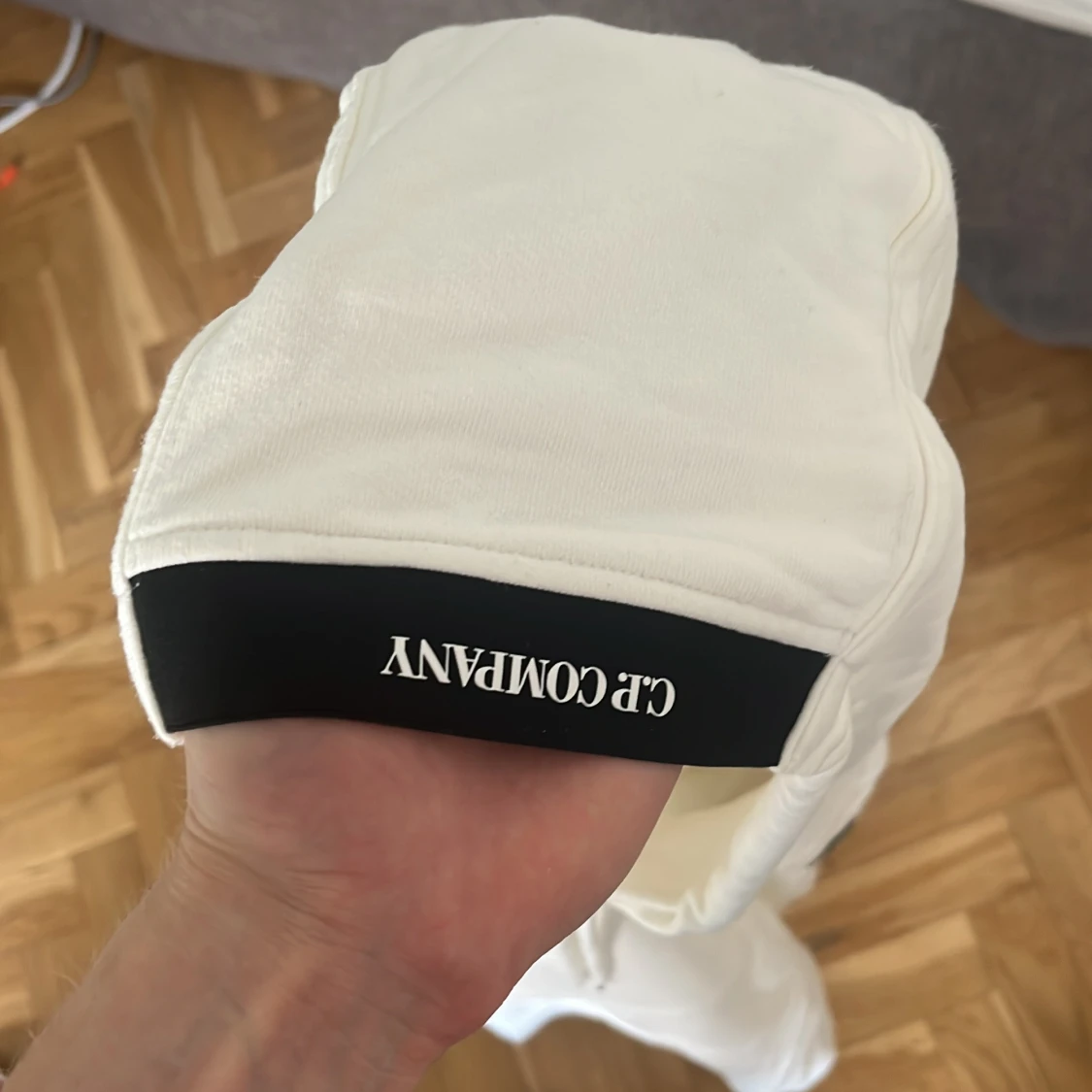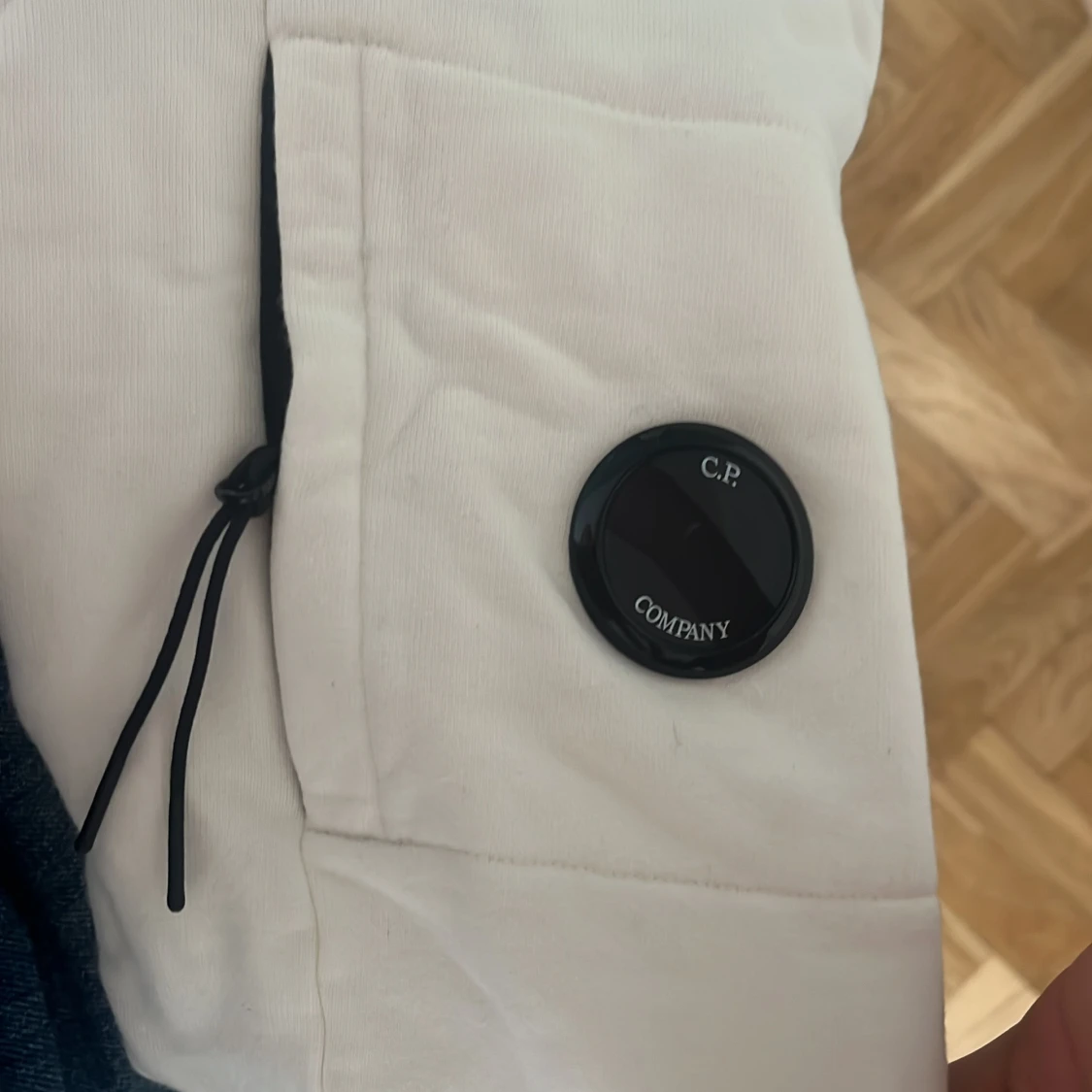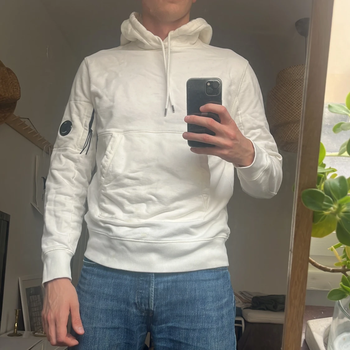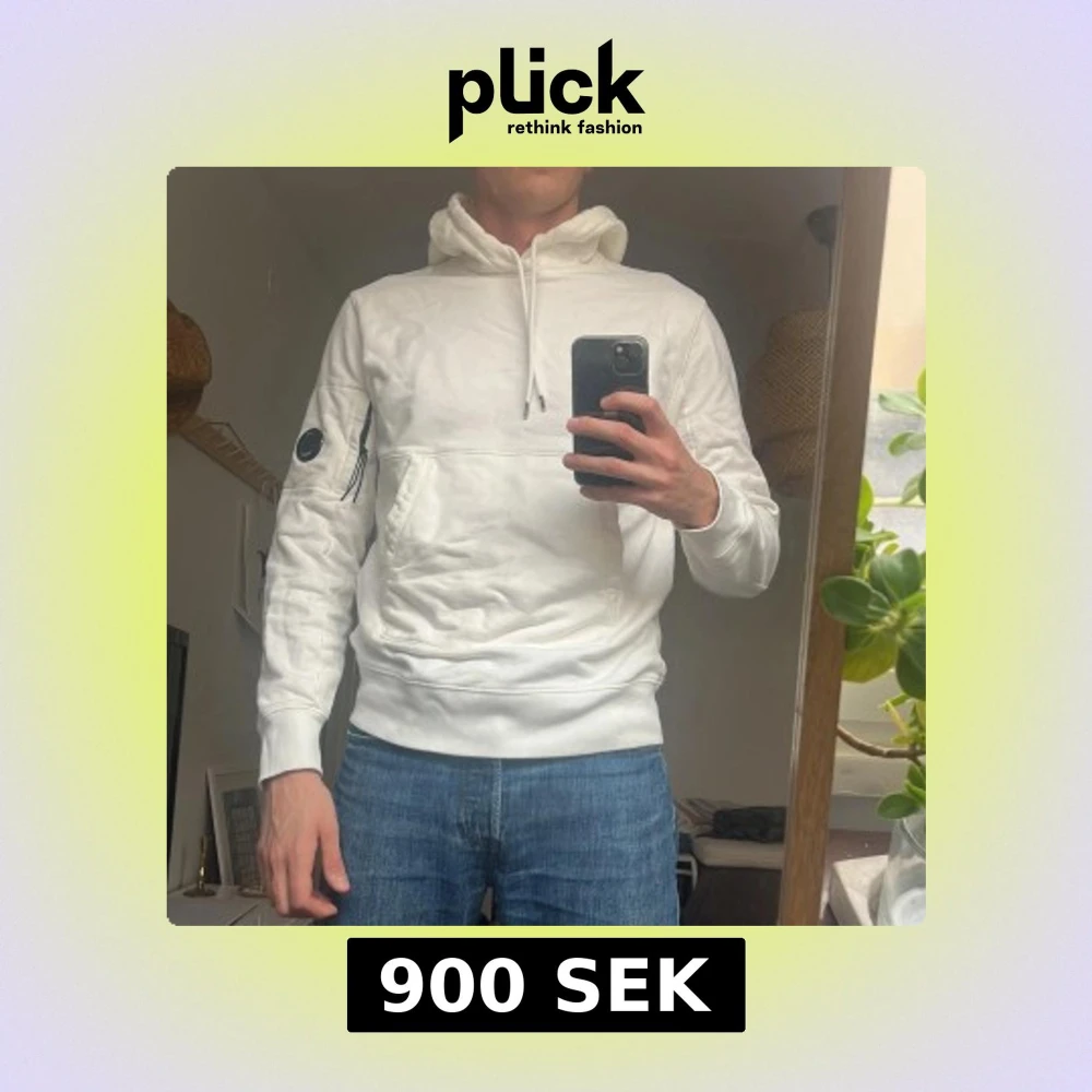 Säljer en stilren vit hoodie från C.P. Company i storlek L (passar mig som är M). Tröjan har huva med snörning, klassisk känguruficka och den ikoniska linsen på ärmen.