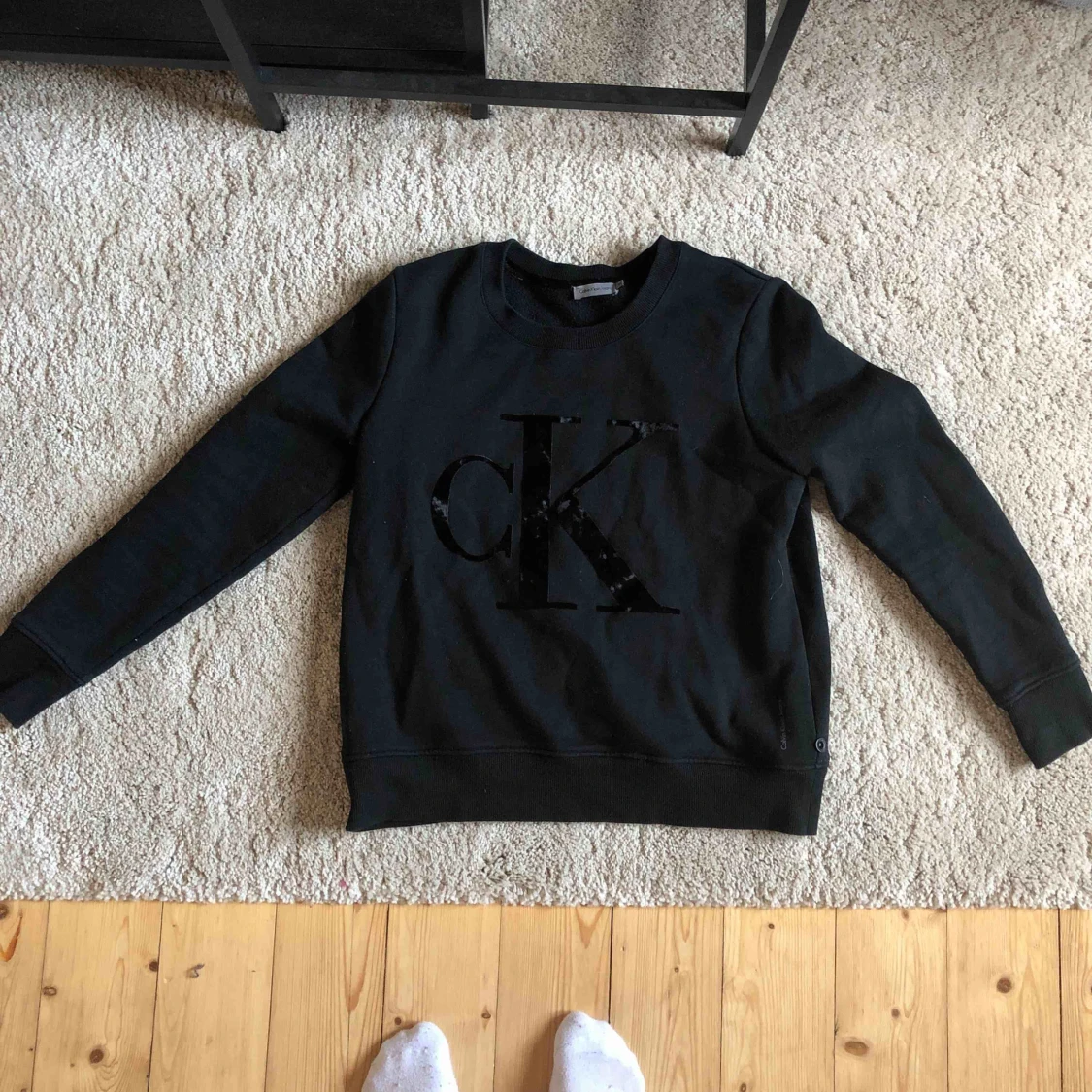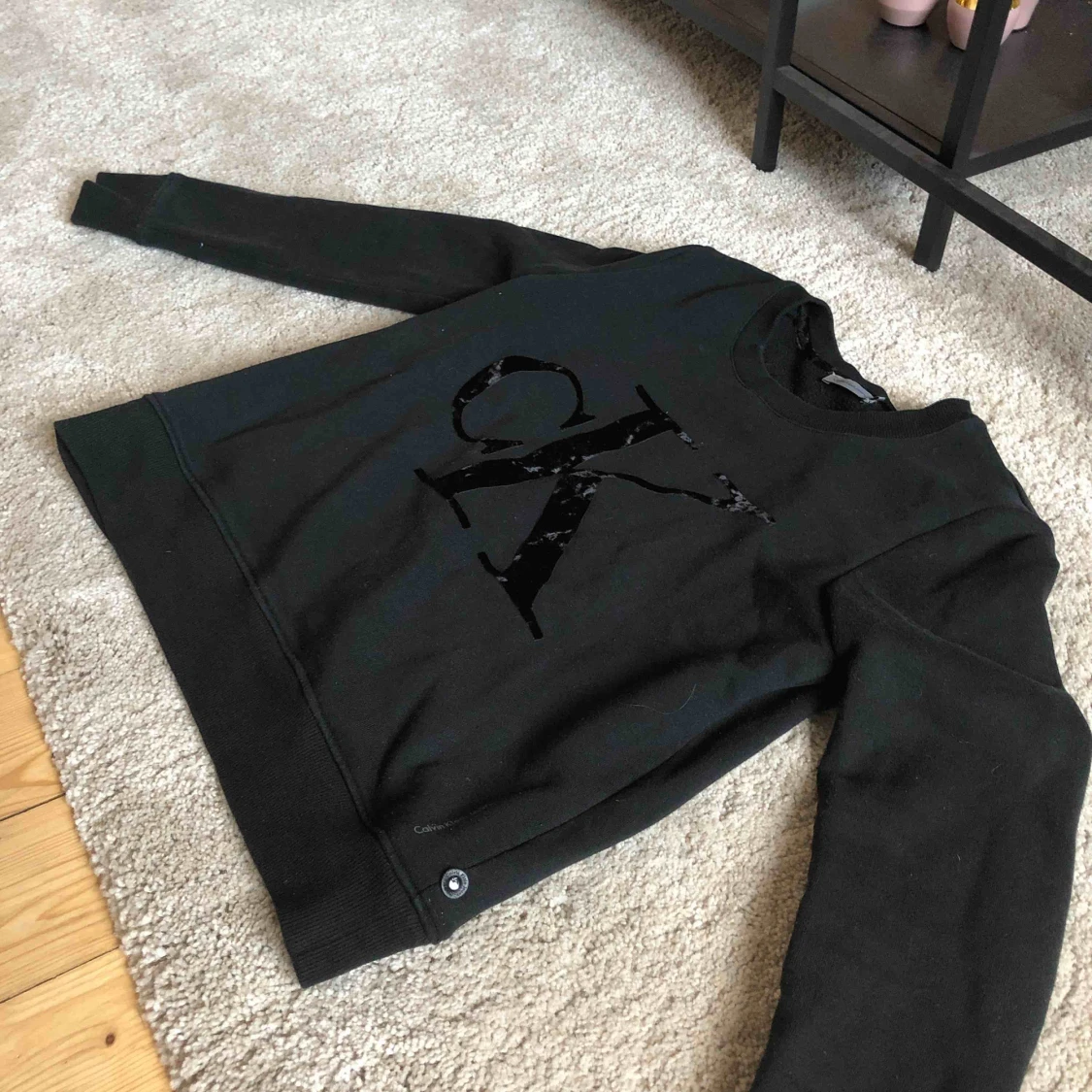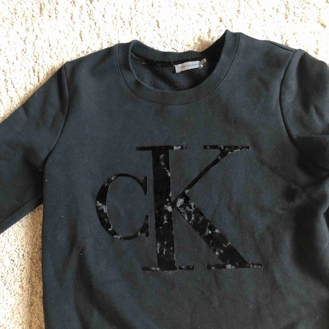 Sweatshirt från Calvin Klein Jeans. Väldigt skön och i gott skick. Ett tryck på framsidan i lite velvetliknande material som skimrar lite snyggt!