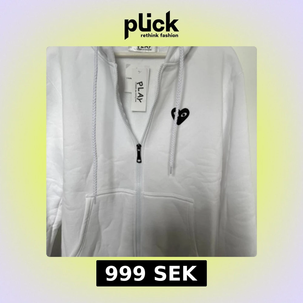 Säljer en vit hoodie från Comme des Garçons Play med svart hjärta-logga på bröstet. Tröjan har huva med snörning, half zip och känguruficka. Perfekt för dig som gillar stilrena och trendiga plagg.