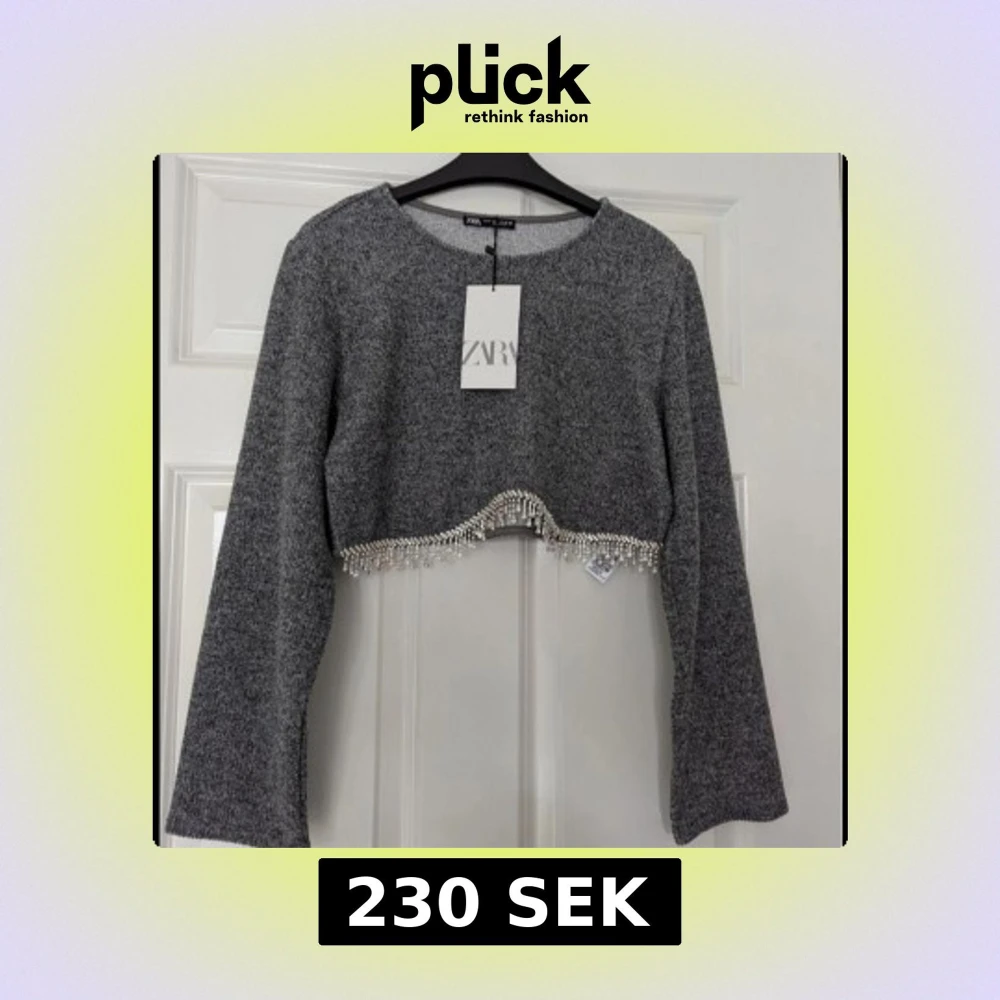 Säljer en superfin grå croppad tröja från Zara. Detaljerad med glitter längs nederkanten. Tröjan är endast använd en gång