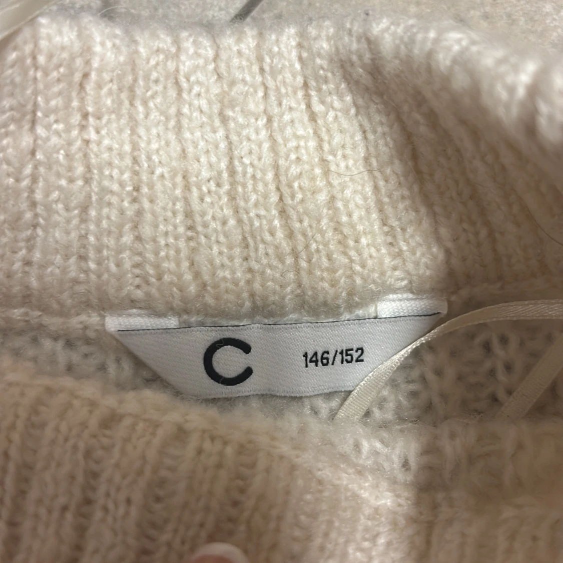 Mysig beige/vit stickad tröja/klänning från Cubus i storlek 146/152. Tröjan har en rak passform, ribbade muddar vid ärmslut och nederkant samt en högre rund hals. Perfekt för kyliga dagar och enkel att matcha med jeans eller kjol.