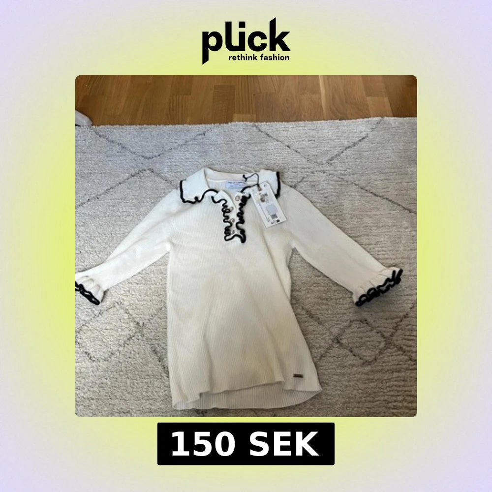 Supersöt vit ribbad tröja från Holly & Whyte med svarta volangdetaljer vid krage, ärmslut och knappslå. Tröjan har lång ärm och en pärlknapp framtill. Perfekt för dig som gillar unika detaljer!