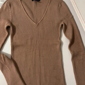 Säljer en beige ribbad tröja från Amisu. Tröjan har en v-ringad design och långa ärmar, perfekt för en bekväm look. Passar utmärkt till både jeans och kjol.
