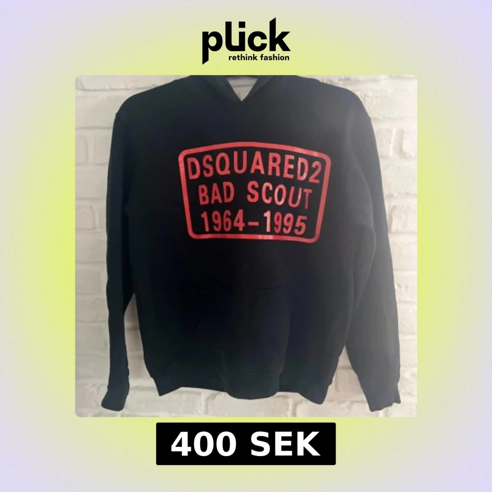 Svart hoodie från Dsquared2 med stor röd print på bröstet där det står 'DSQUARED2 BAD SCOUT 1964-1995'. Väldigt fin hoodie storleks lappen är borta men passar 165-170 skulle jag säga.