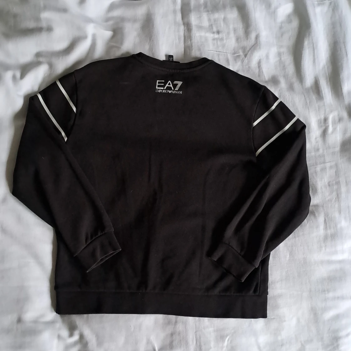 Svart sweatshirt från EA7 Emporio Armani med vit logga och tryck över bröstet. Tröjan har rund hals, långa ärmar och vita ränder på axlarna. Mjuk bomullskvalitet och normal passform, perfekt för en clean och stilren look.