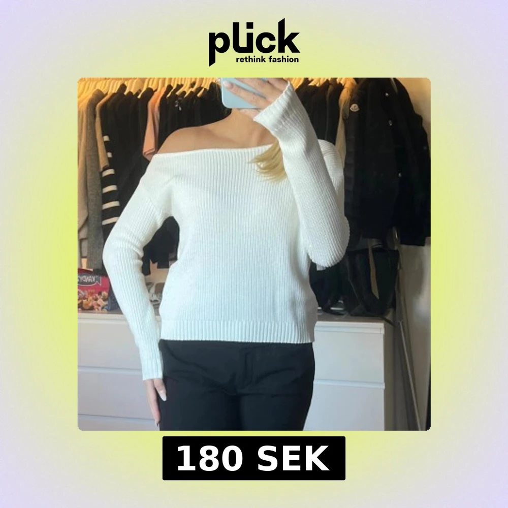 Säljer en vit stickad tröja med ribbad struktur och offshoulder-modell. Tröjan har lång ärm och en snygg, avslappnad passform som ger en trendig look. Perfekt för dig som vill ha en stilren och modern vibe.