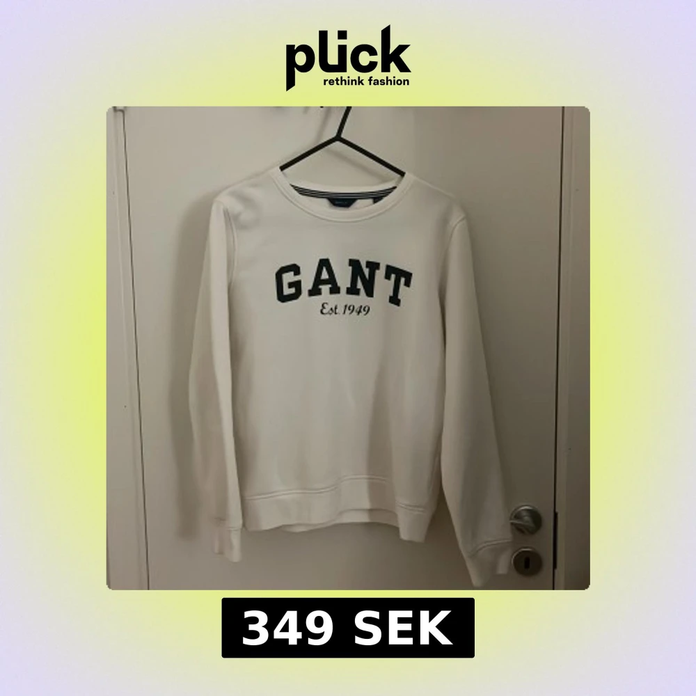 Säljer en stilren vit sweatshirt från GANT med mörkgrön text 'GANT Est. 1949' på framsidan. Tröjan har långa ärmar och en rund halsringning. Perfekt för en avslappnad stil.
