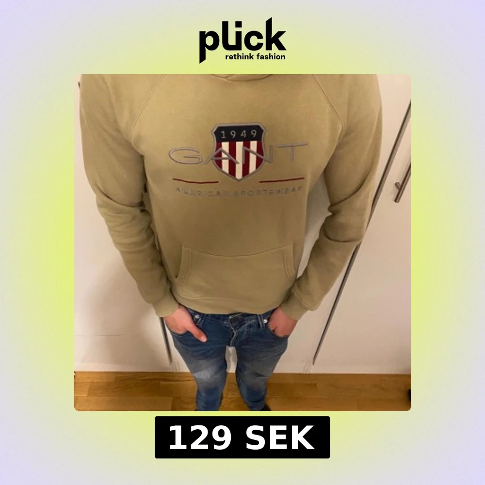 Säljer en beige hoodie från GANT med stort broderat tryck och sköld på bröstet. Tröjan har huva, magficka och långa ärmar. Perfekt för dig som gillar klassisk streetstyle och vill ha något bekvämt och snyggt.