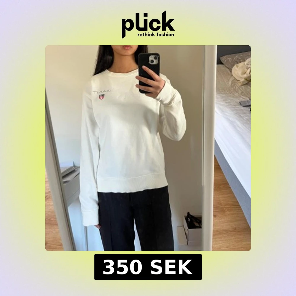 Säljer en stilren vit sweatshirt från Gant med deras logga och ett litet emblem på bröstet. Tröjan har långa ärmar och en rund halsringning. Fint skick. Lite längre i armarna och även på längden. Det står 176 cm, 16 years i den som en barnstorlek men det passar en i storlek S.