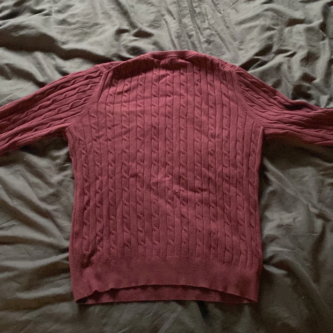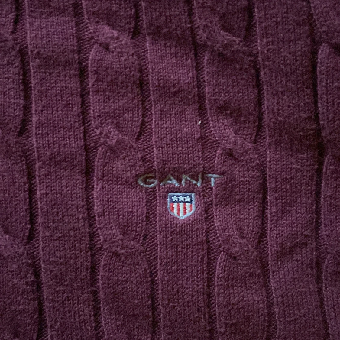Säljer en stilren vinröd kabelstickad tröja från GANT. Tröjan har en klassisk design med rund hals och långa ärmar. Perfekt för kyligare dagar och ger en tidlös look. Storlek s