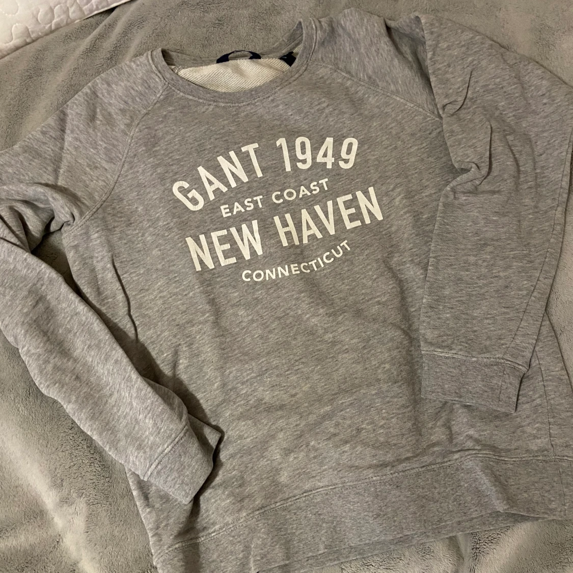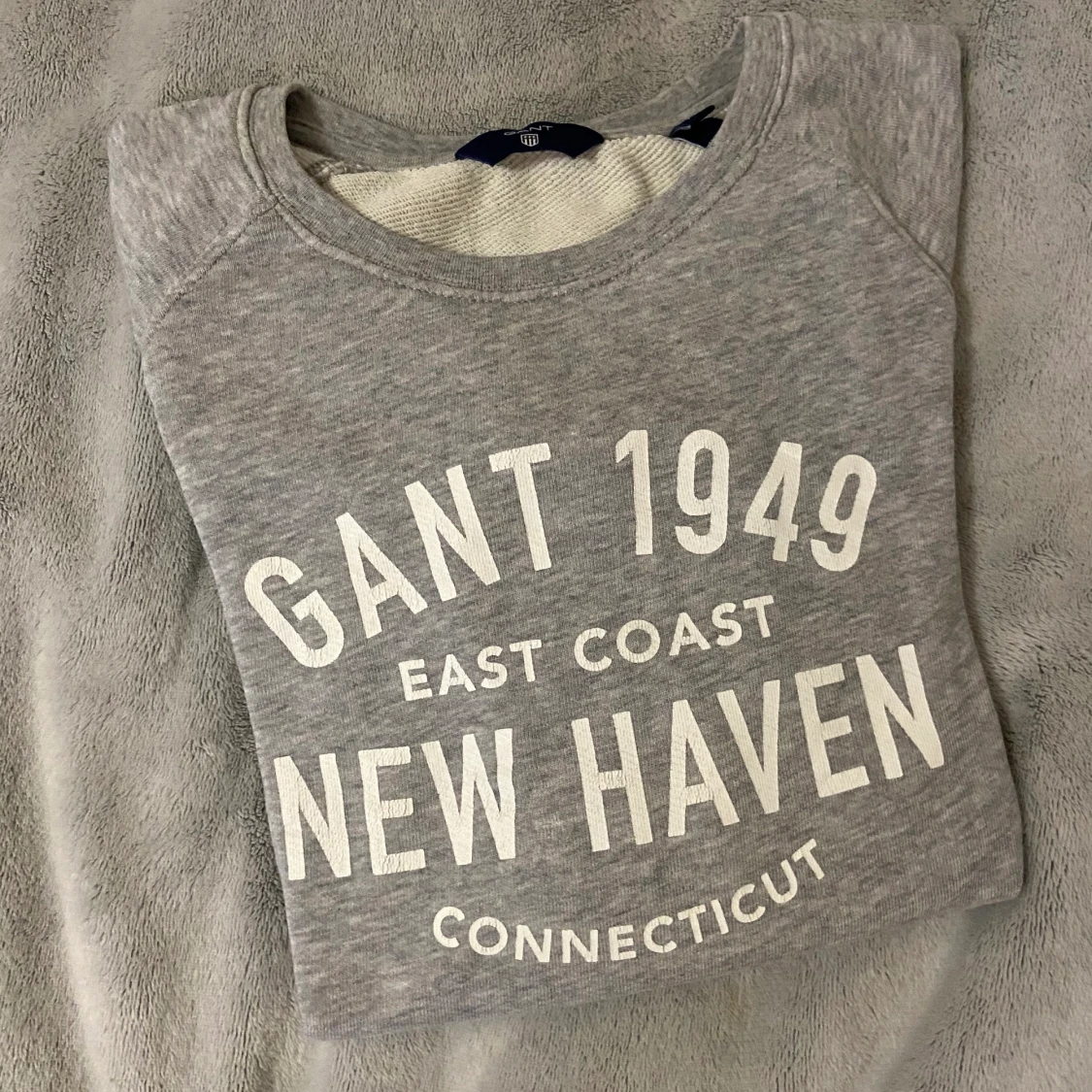 En fin grå collagetröja med märket Gant. Väldigt fint skick! Säljer på grunt av att den är för liten. Storlek XS, frakt tillkommer💓