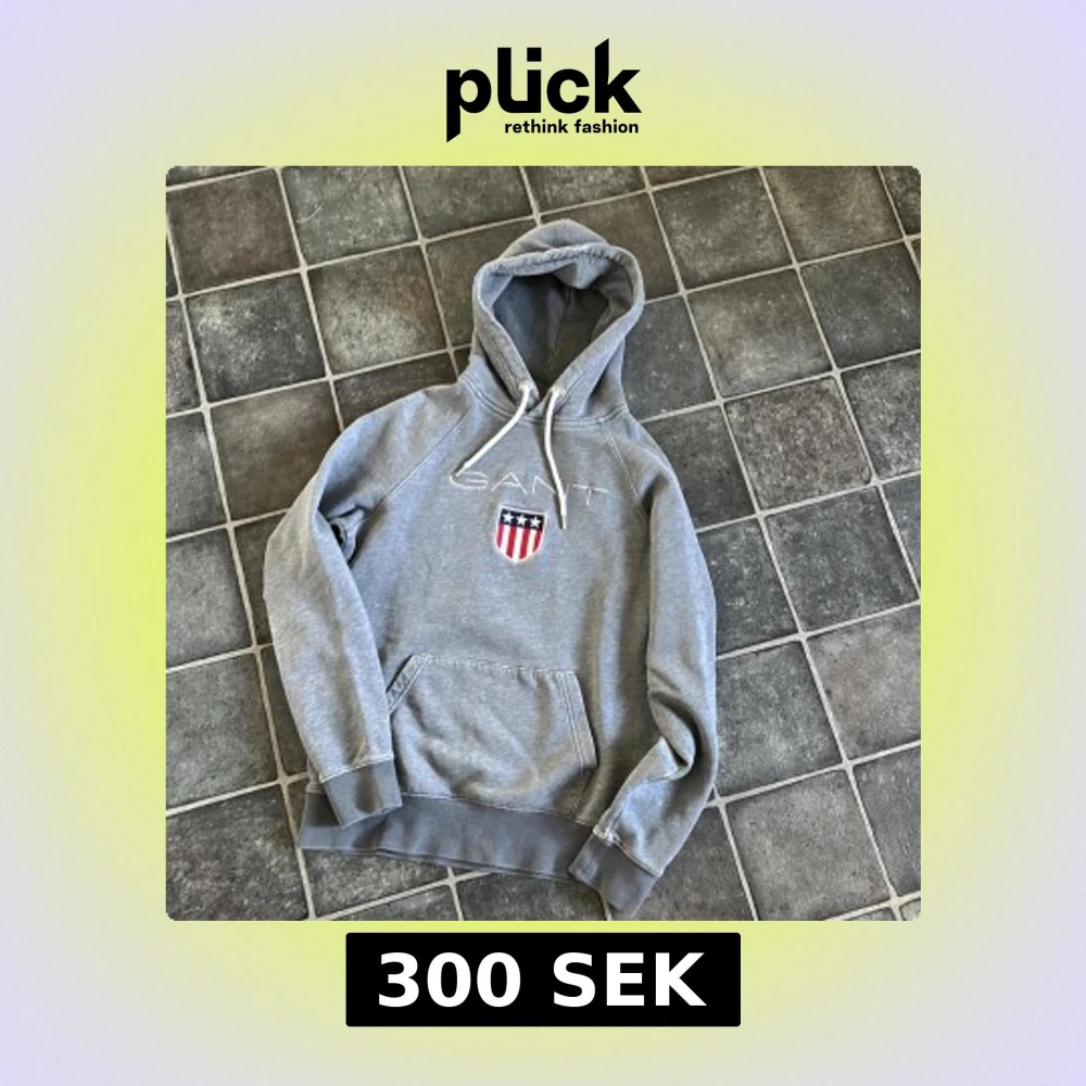 Säljer en grå hoodie från GANT med broderad logga och sköld på bröstet. Tröjan har huva med dragsko och en stor magficka. Klassisk och stilren design med ribbade muddar vid ärmslut och nederkant. Har lite blekta linjer på vissa ställen, se bild 4 och 5.