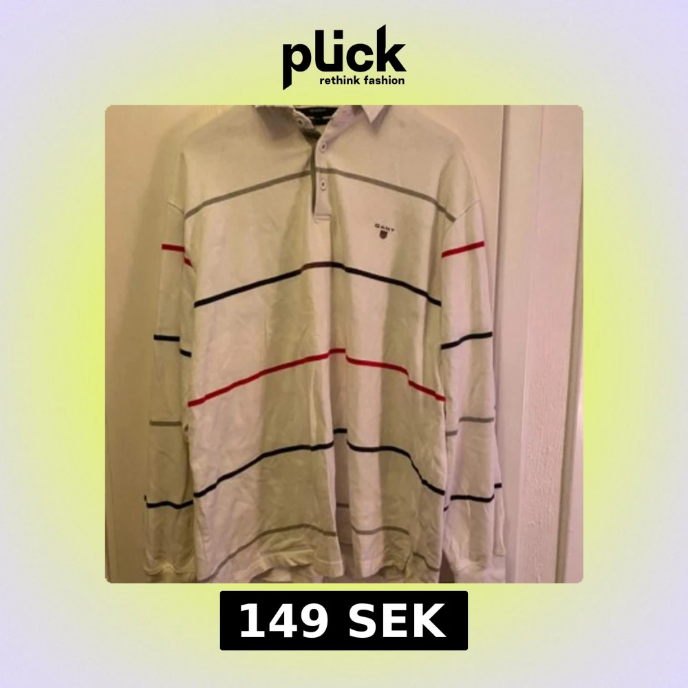 Säljer en stilren vit pikétröja från GANT med färgglada ränder i grått, svart och rött. Tröjan har långa ärmar och en klassisk krage med knappar. Perfekt för en avslappnad men ändå snygg look. Har tyvärr lite missfärgning men bör gå att få bort