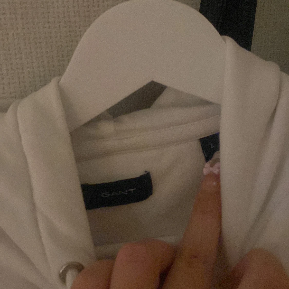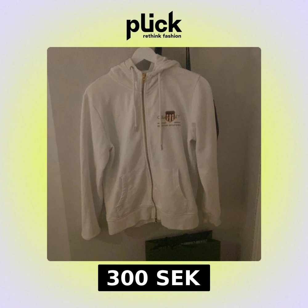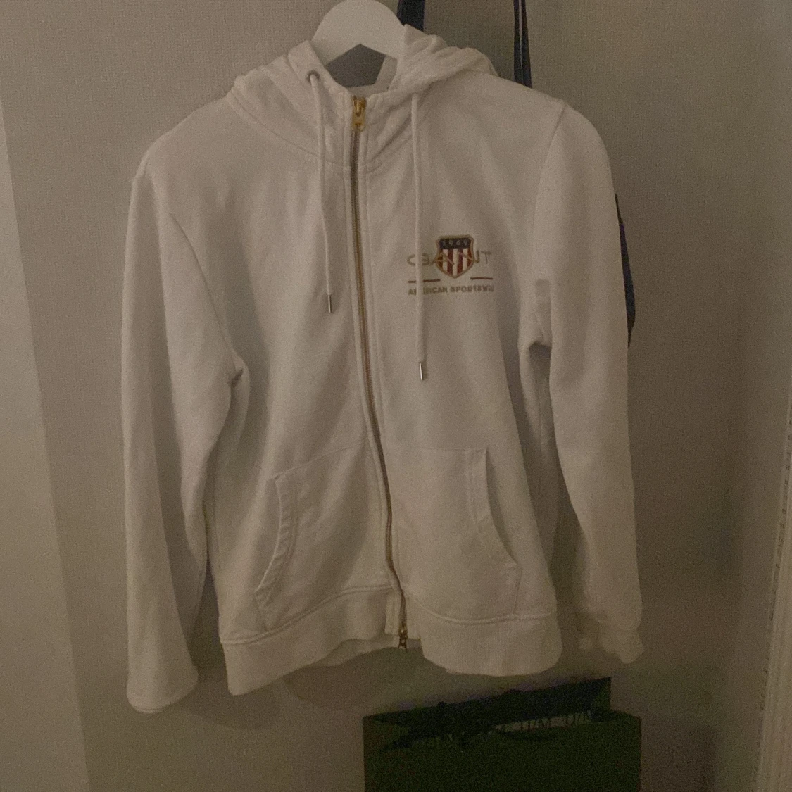 Säljer en stilren vit hoodie från Gant med dragkedja och huva. Tröjan har en broderad logotyp på bröstet och praktiska fickor framtill. Perfekt för en avslappnad stil.