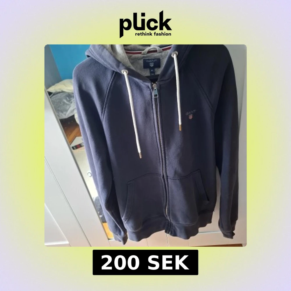 Säljer en mörkblå hoodie från GANT med dragkedja och vit snörning i huvan. Tröjan har två fickor framtill och en liten broderad GANT-logga på bröstet. Insidan av huvan är ljusgrå och materialet är mjukt och bekvämt.