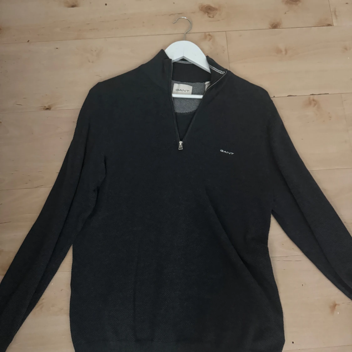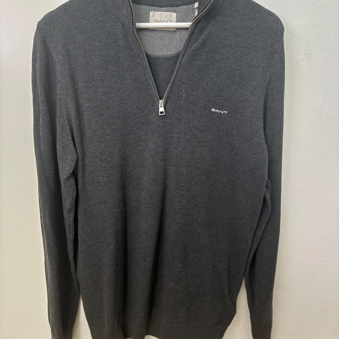 Snygg mörkgrå långärmad tröja från GANT med half zip och liten broderad logga på bröstet. Tröjan har en klassisk passform och är tillverkad i ett mjukt stickat material som känns skönt mot huden. Perfekt för lager-på-lager och stilren look.