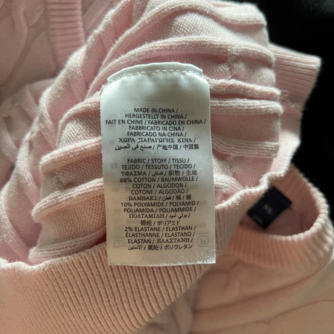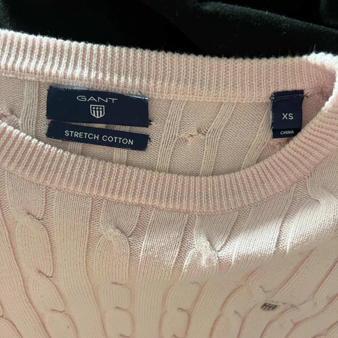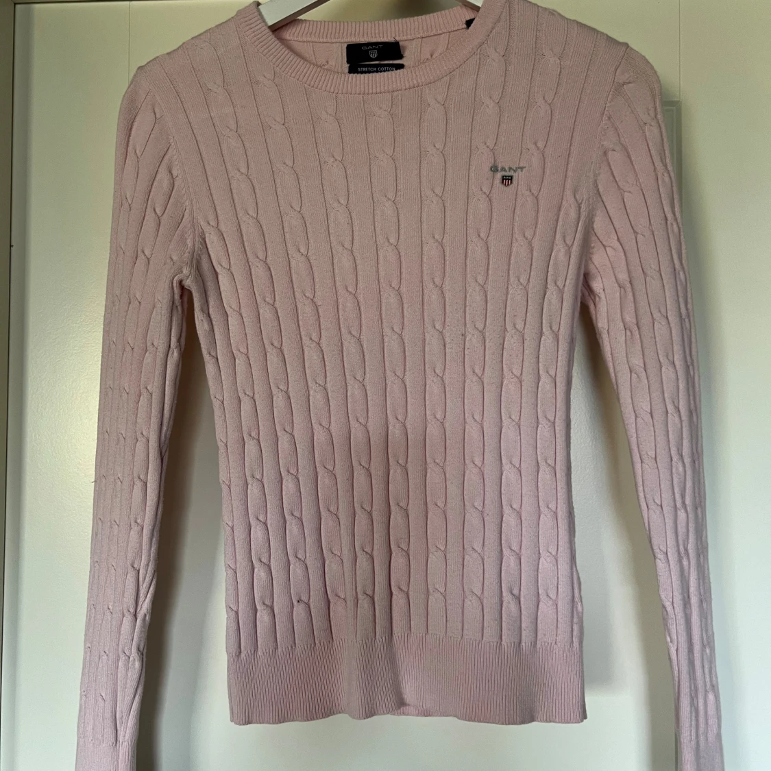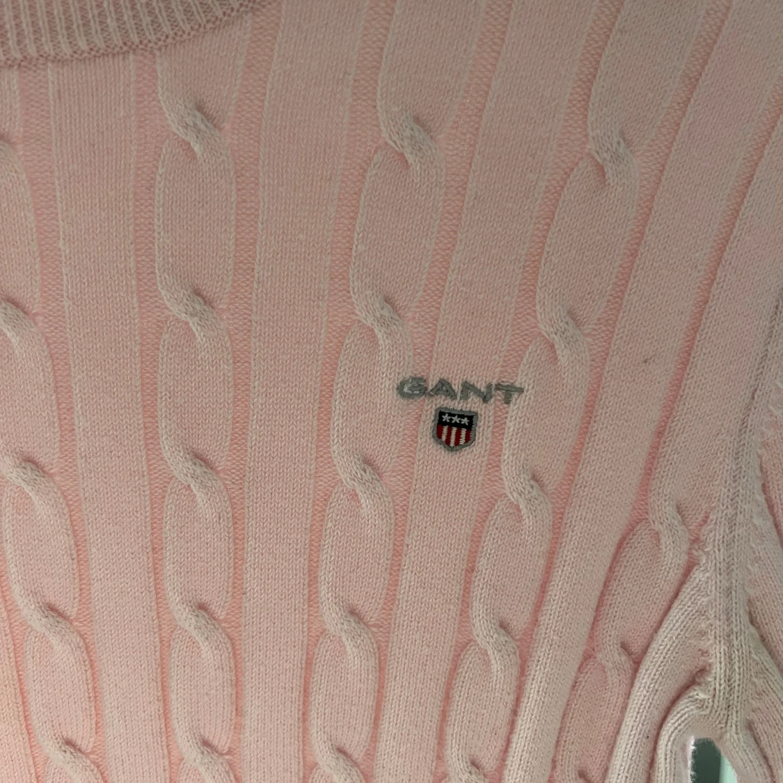 Ljusrosa kabelstickad tröja från Gant i stretchig bomullsblandning. Klassisk rund halsringning, diskret logga på bröstet och ribbade muddar. Sista bilden visar hur färgen ser ut, de första bilderna stämmer inte riktigt i färgen. Använd och lite noppig men har mer att ge.