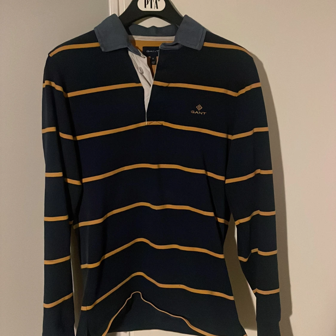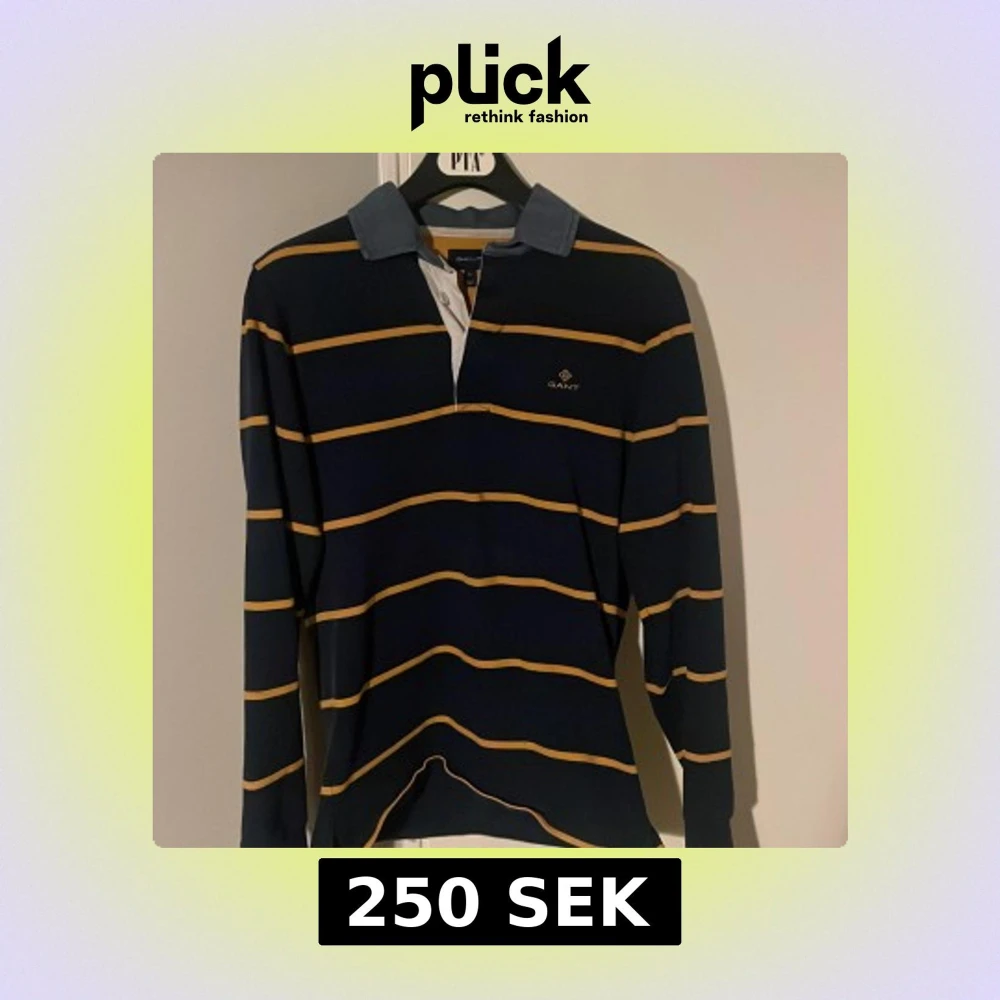Snygg marinblå pikétröja från GANT i storlek S med gula ränder och klassisk krage i ljusblått. Tröjan har lång ärm och knäppning framtill. Perfekt för dig som gillar preppy stil och vill ha något som sticker ut lite extra.