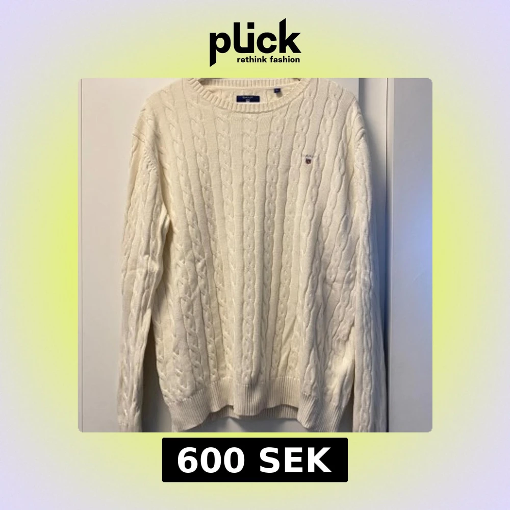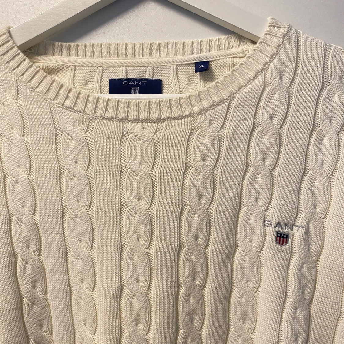 Säljer en vit kabelstickad tröja från GANT i storlek XL. Tröjan har rund hals, ribbade muddar och ett broderat GANT-logo på bröstet. Perfekt för dig som gillar klassisk och clean stil. Materialet är mjukt och skönt, passar när du vill vara både chill och snygg.
