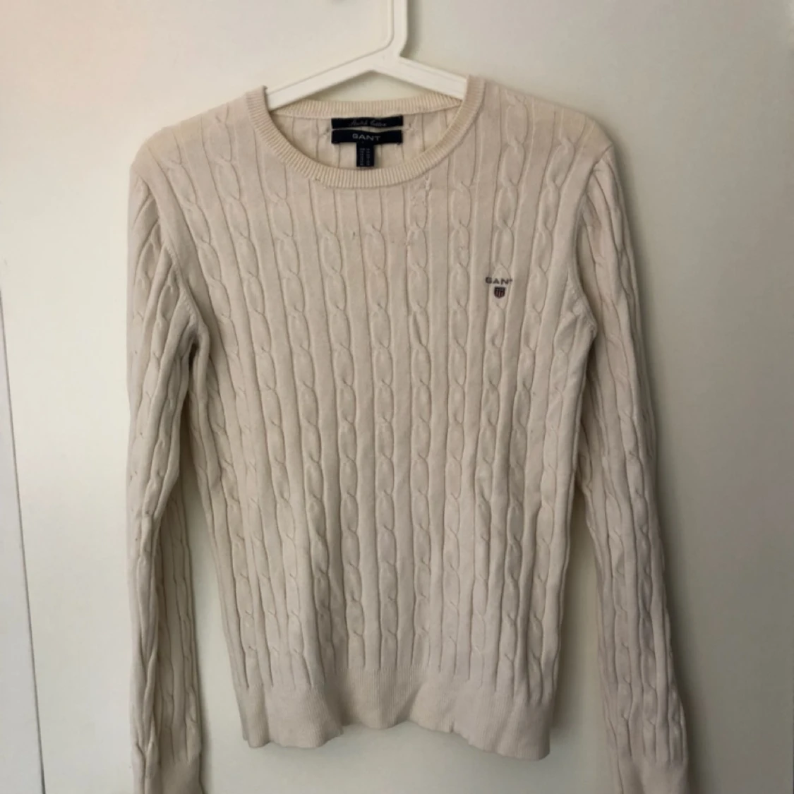 Fin benvit/creme-färgad kabelstickad GANT-tröja. Fick små hål i tvättmaskin som är lagat så att det inte syns längre (se närbild nr 2). Använd ett fåtal gånger.