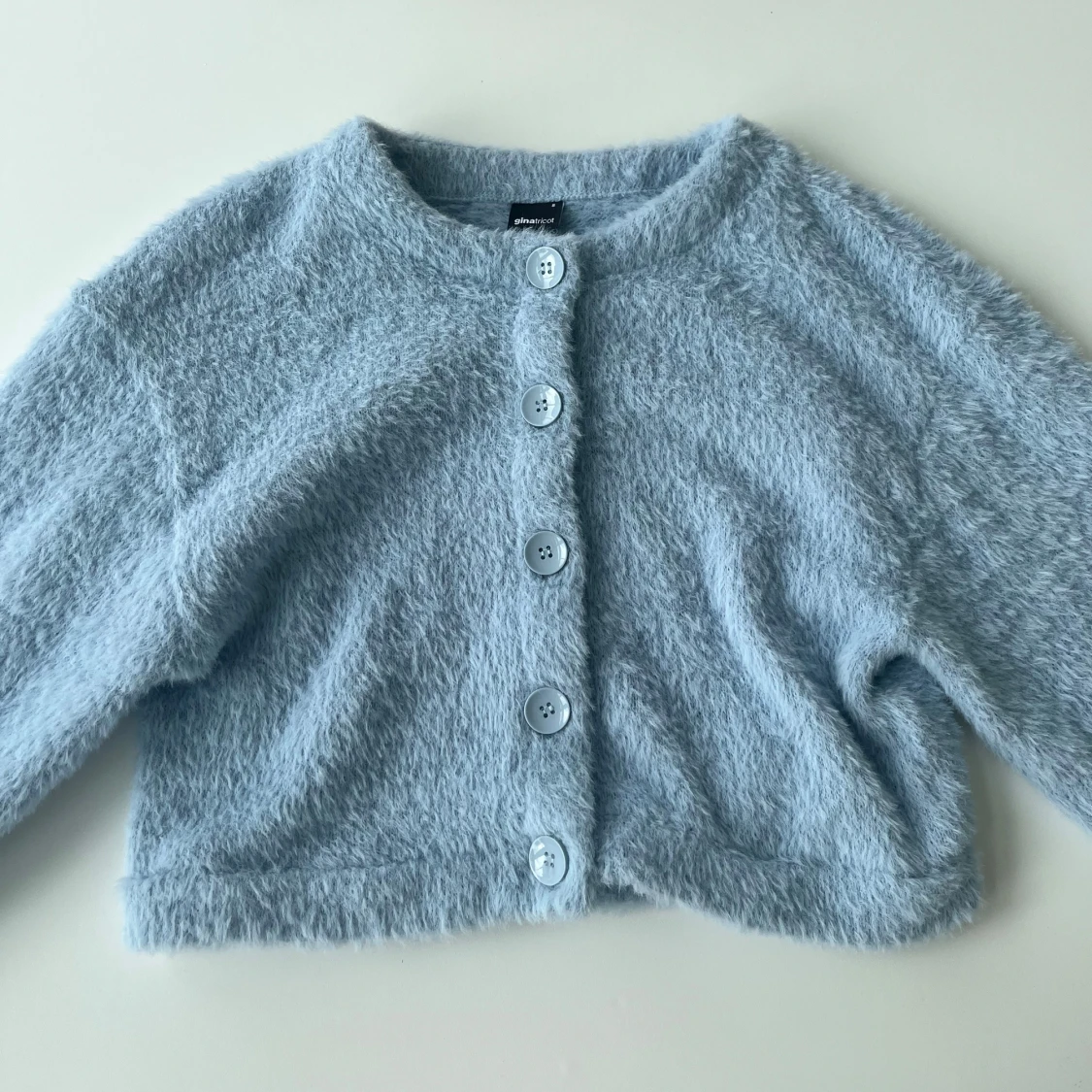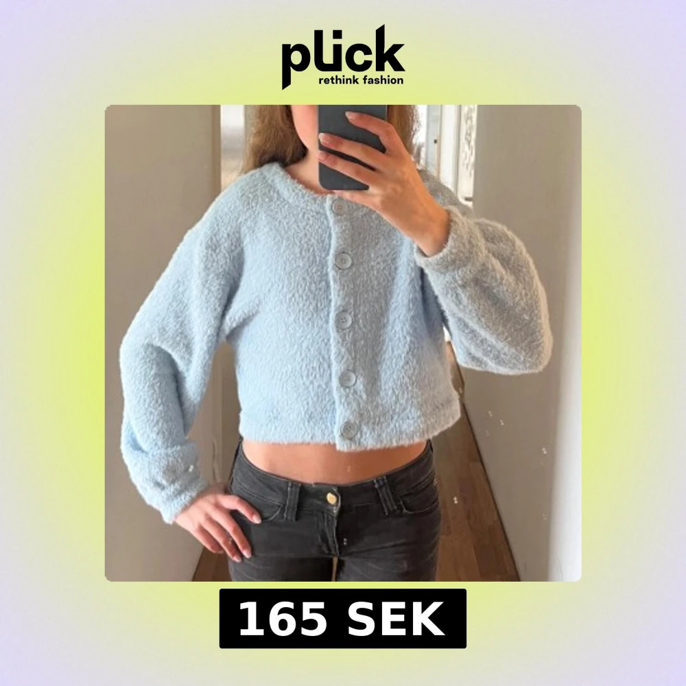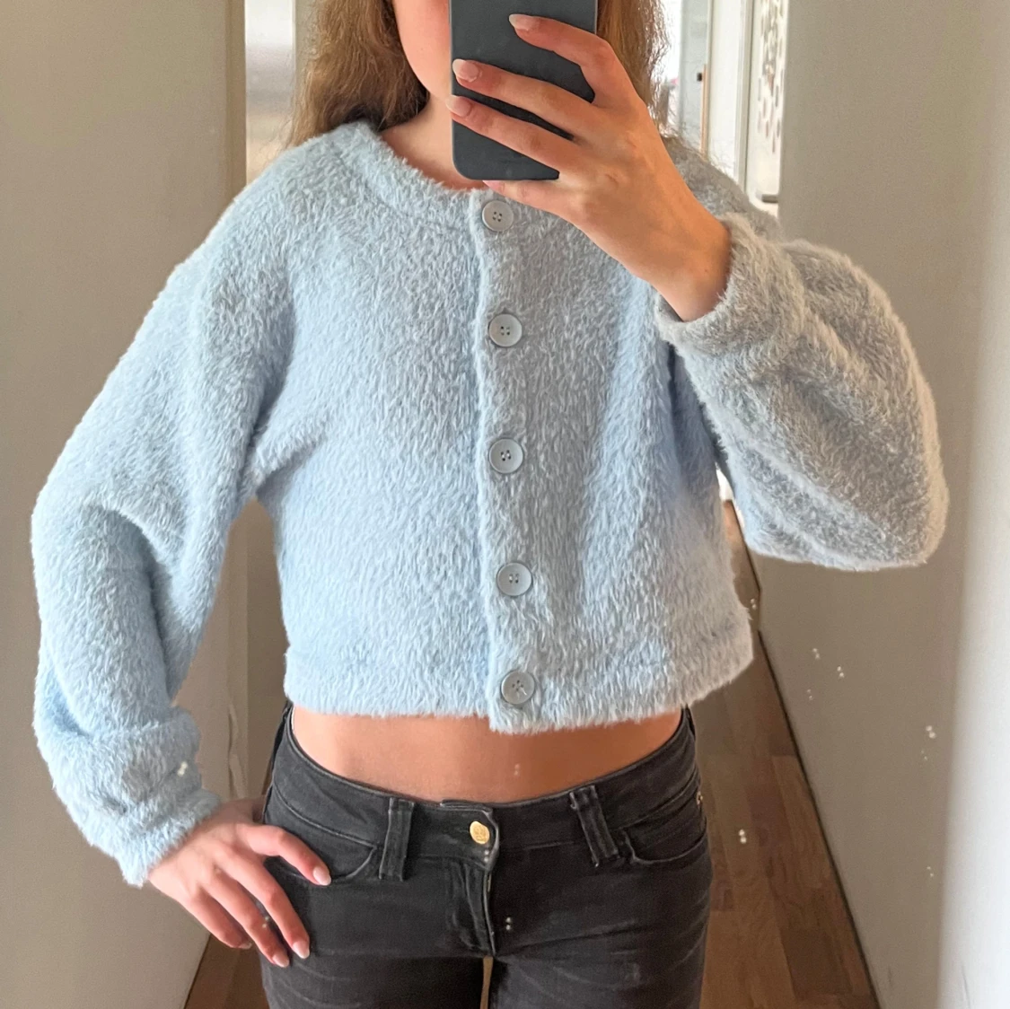 Supermjuk, lite croppad ljusblå kofta från Gina Tricot. Koftan är i ett ”fluffigt” material och är väldigt skön. Den är i storlek S och är i väldigt bra skick.