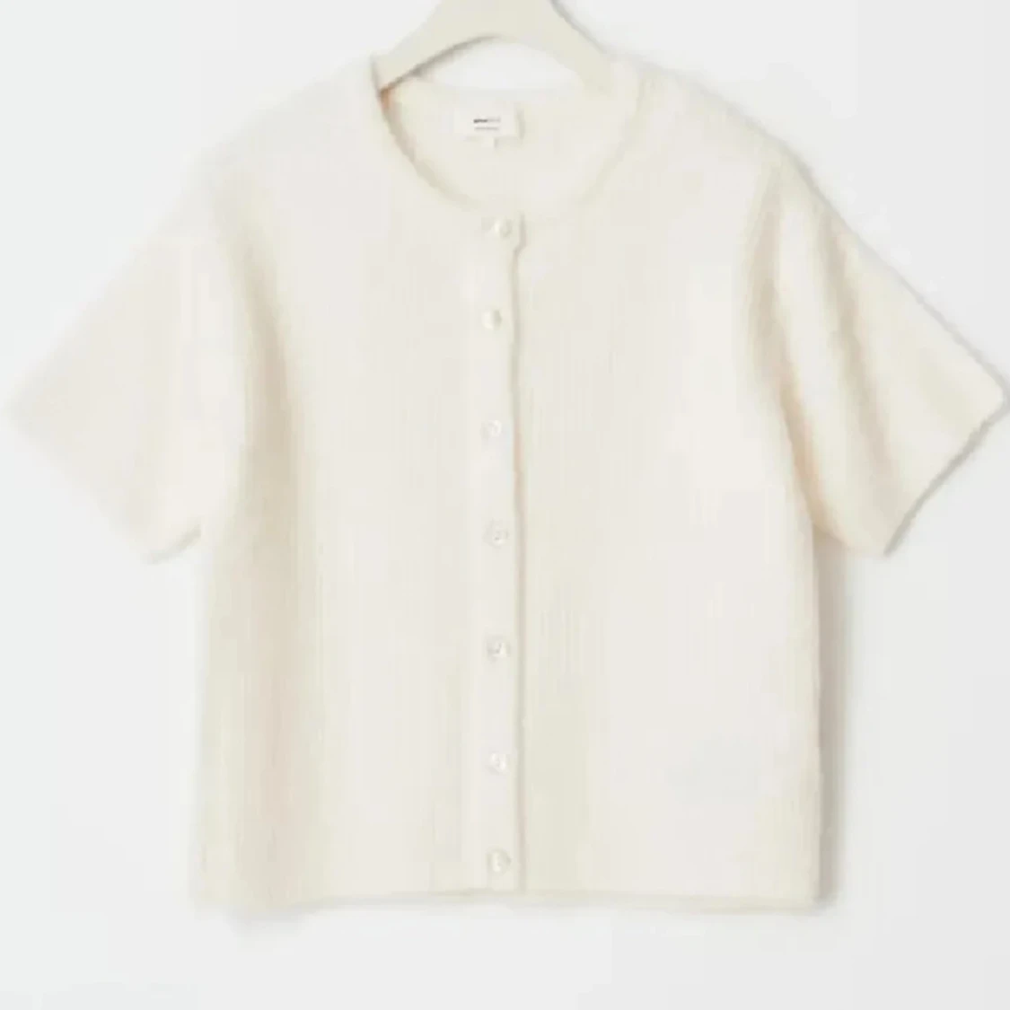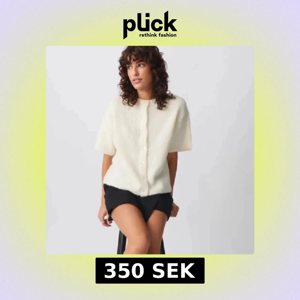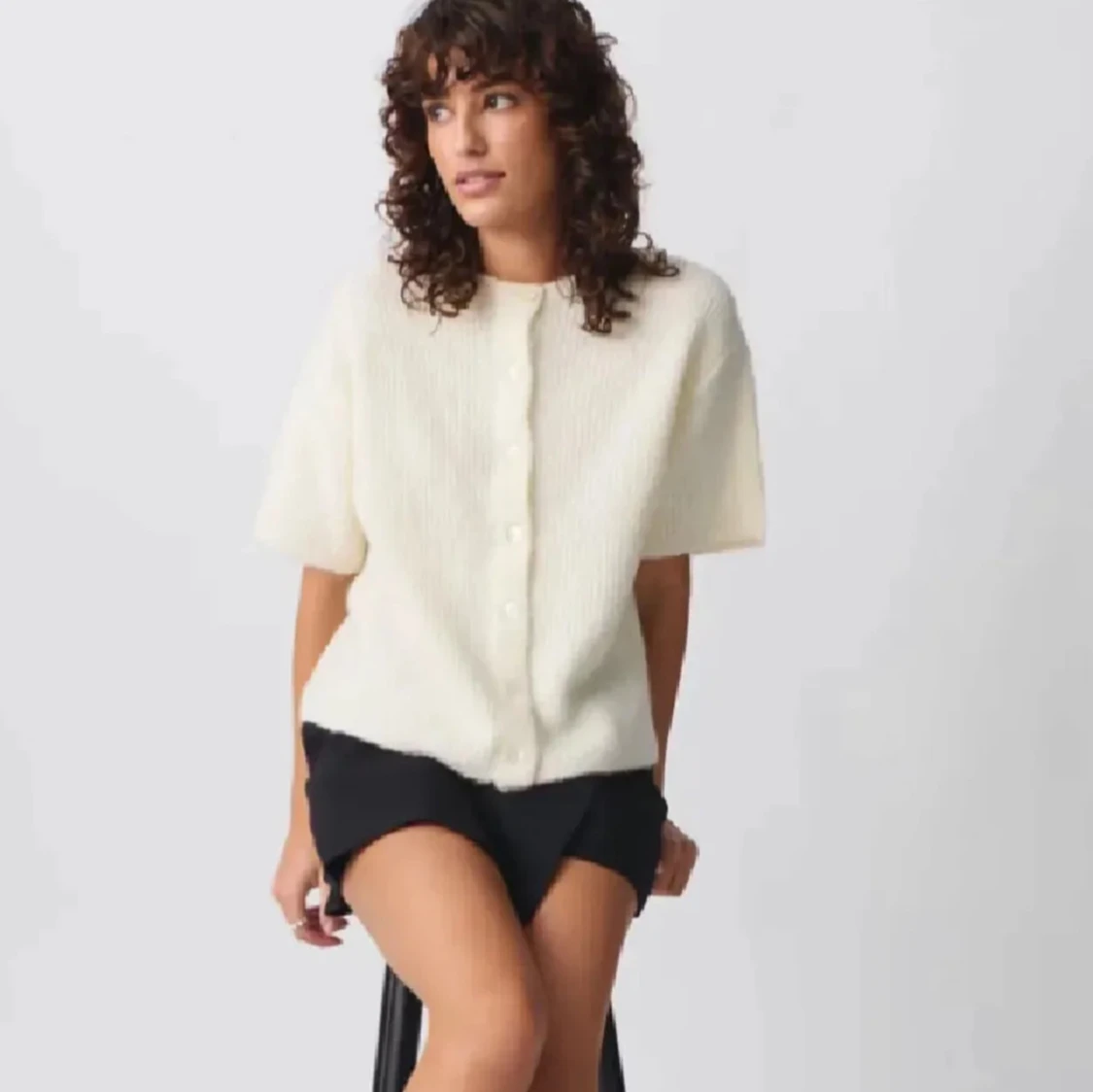 Superfin vit stickad kofta från Gina med korta ärmar och rund hals. Koftan har en rak passform och knäpps med pärlemorknappar framtill. Perfekt att slänga över en topp för en chill och stilren look.