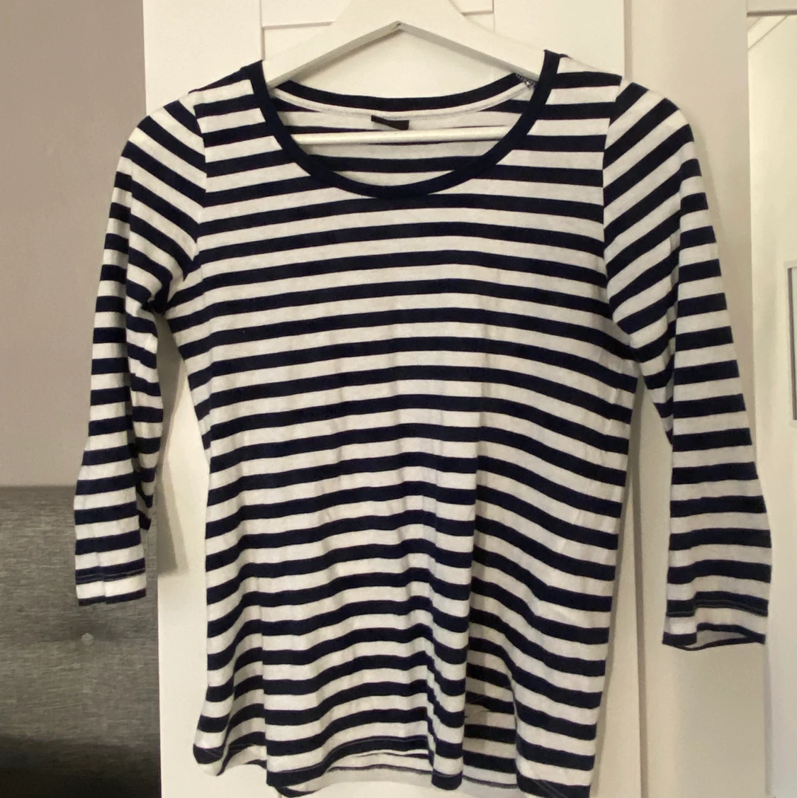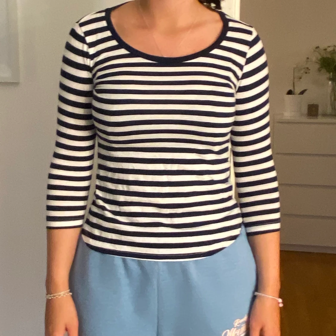 En vit & marinblå randig tröja från GinaTricot i storlek xs med trekvartslånga armar. Säljes för 40 kr+frakt