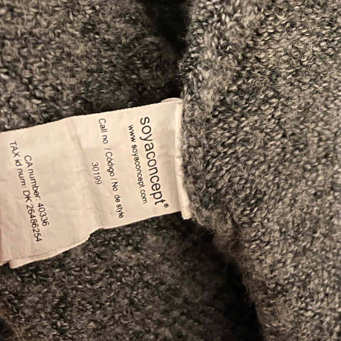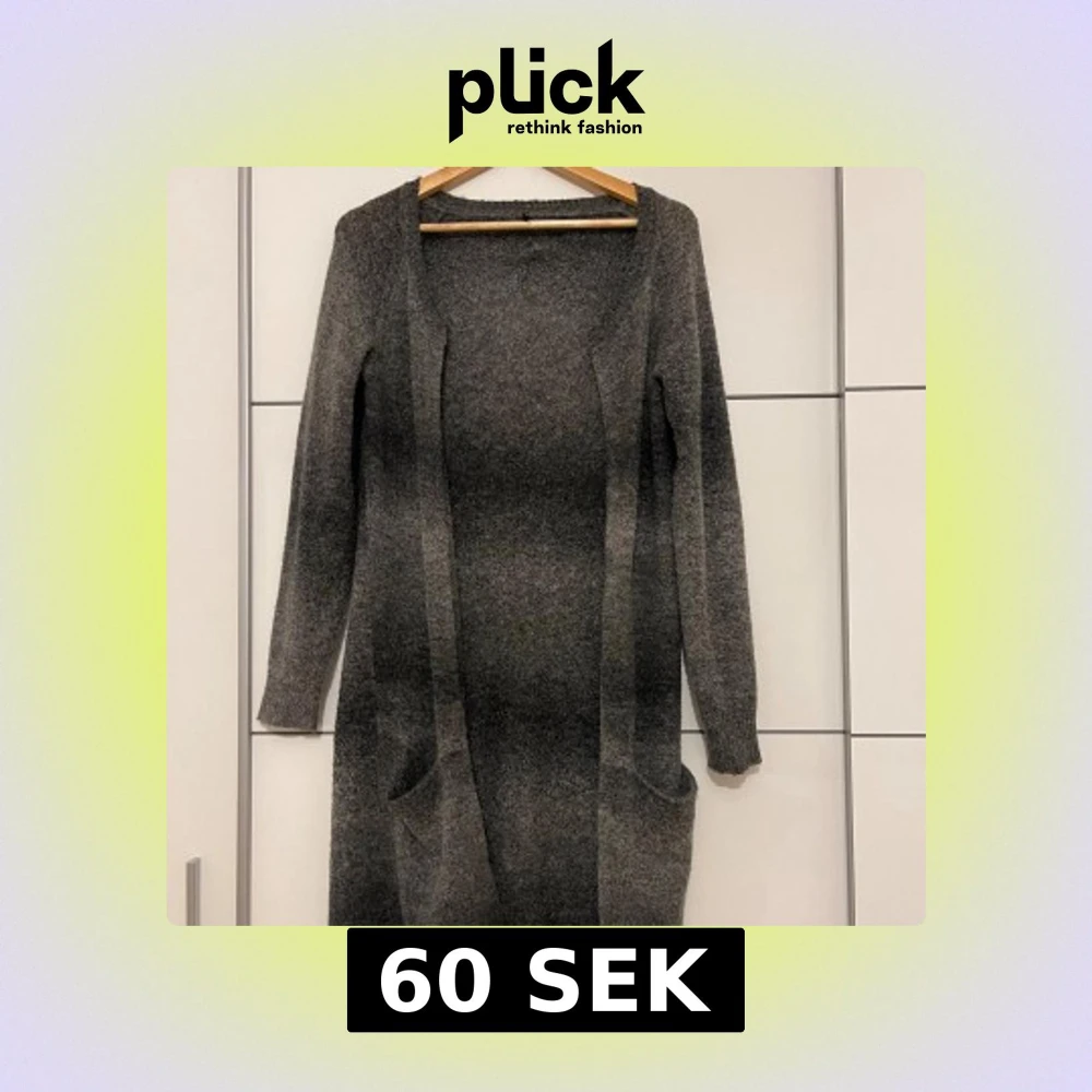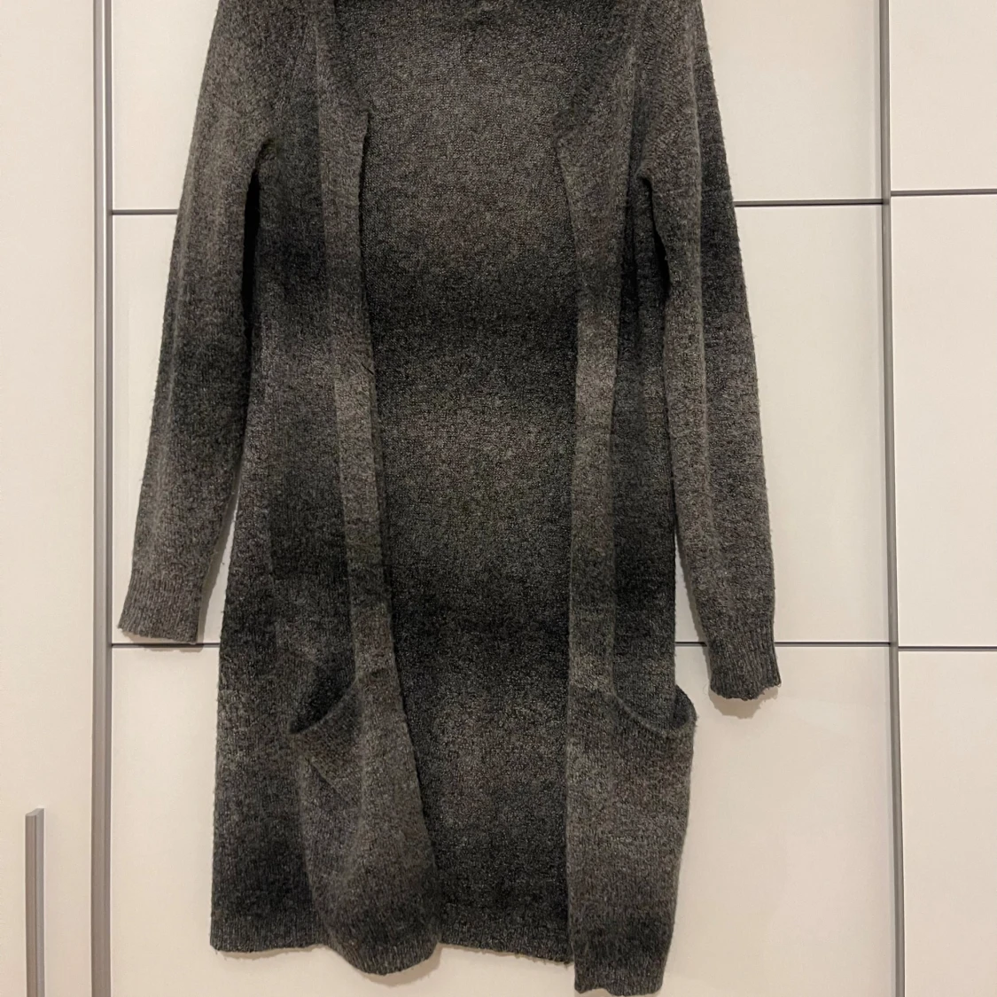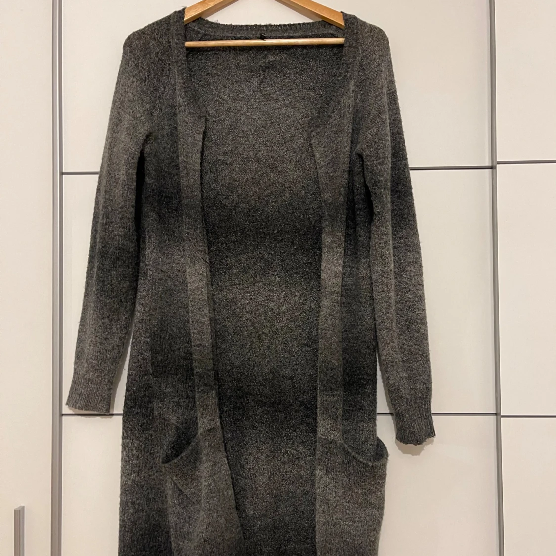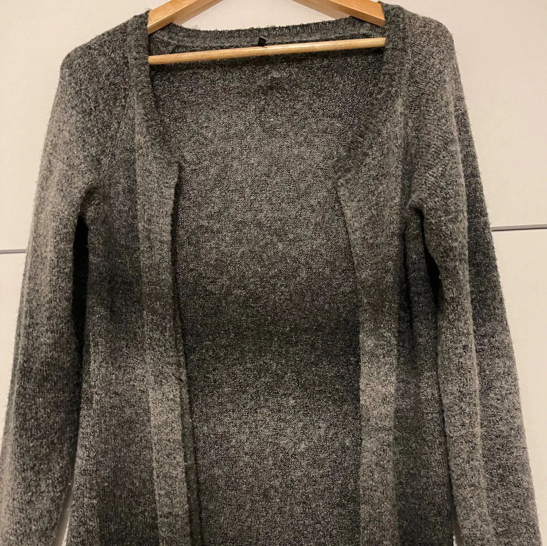 Mysig och lång kofta i mörkgrå ton från Soyaconcept. Koftan har två stora fickor framtill, är öppen utan knappar.