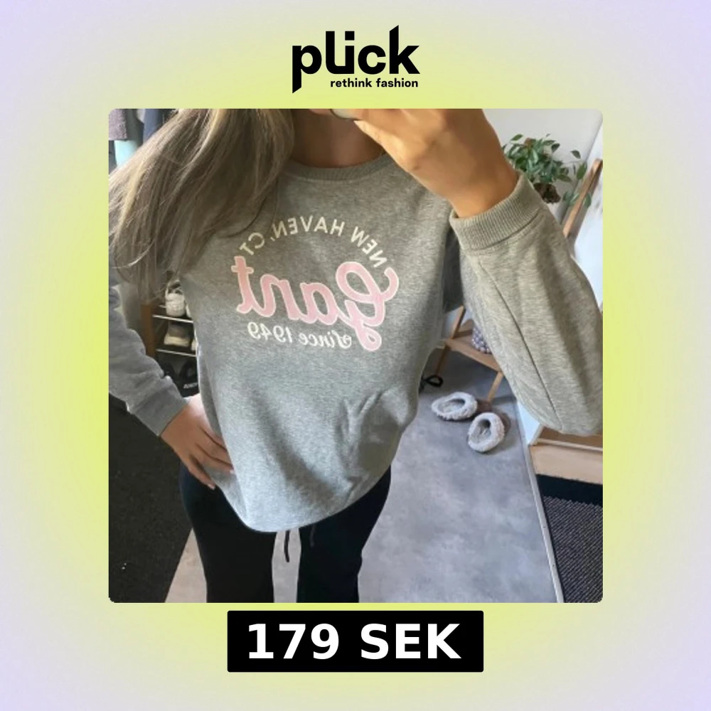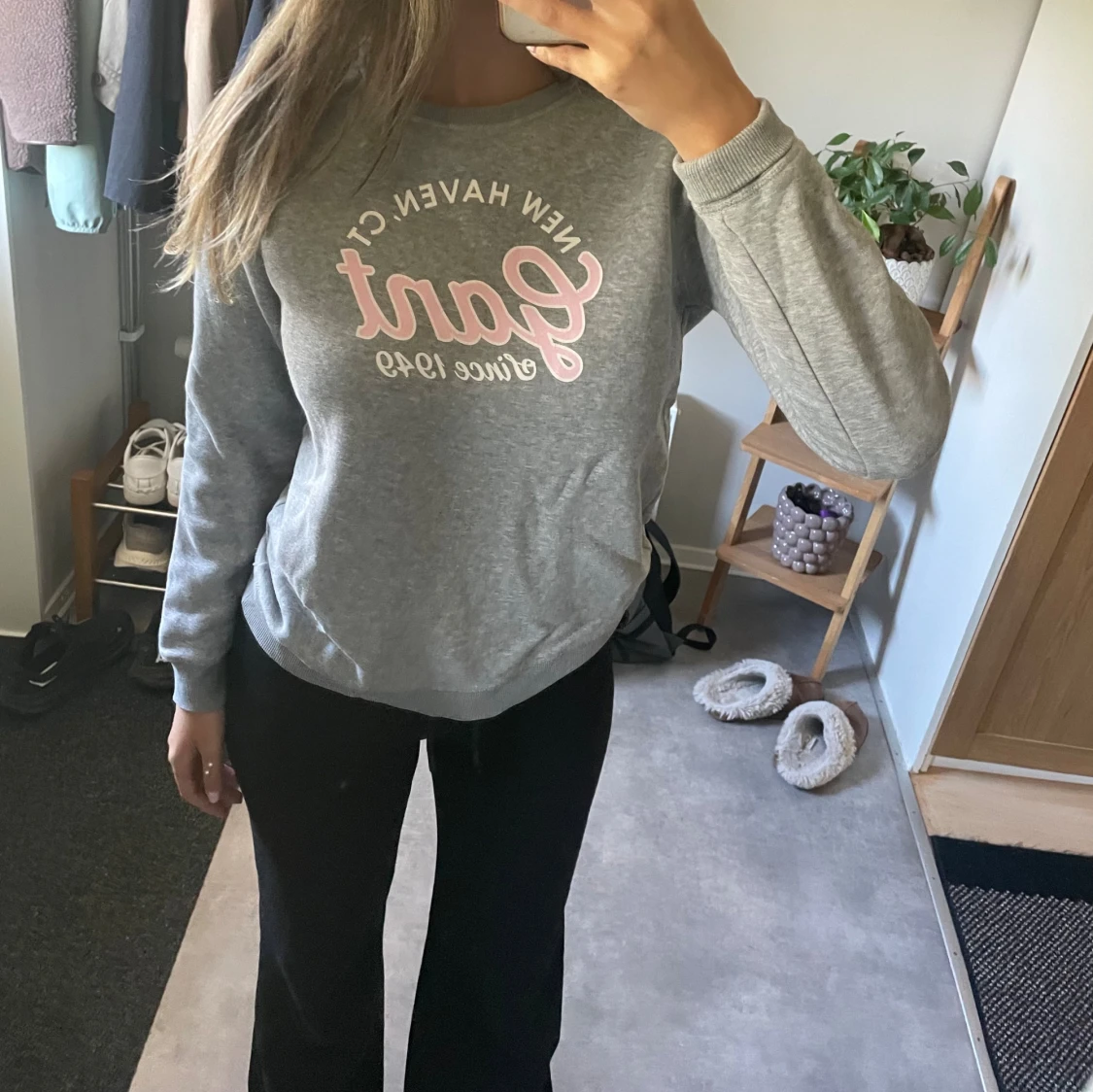 Grå sweatshirt från Gant med rosa och vitt tryck på bröstet.