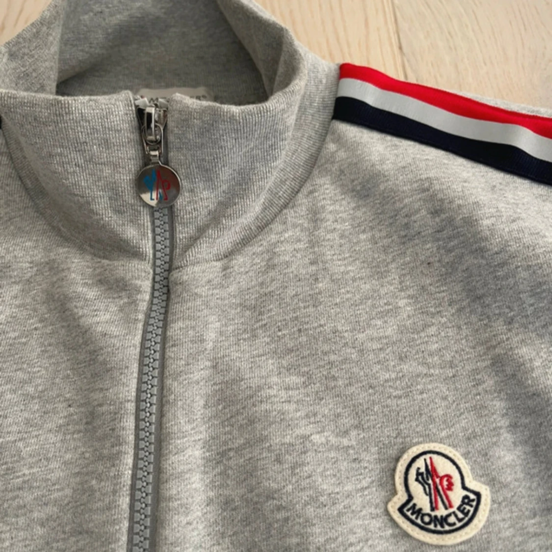 Grå hoodie från Moncler med hel dragkedja och ribbad krage. Snygga röda, vita och marinblå ränder längs ärmarna och Moncler-logga på bröstet. Tillverkad i mjuk bomull, perfekt för en sportig och avslappnad look. Passar S/m