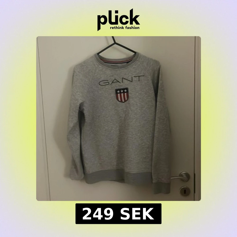 Säljer en stilren grå sweatshirt från GANT med deras ikoniska logga och sköld på bröstet. Tröjan har långa ärmar och en rund halsringning med röd och blå randig detalj på insidan. Perfekt för en avslappnad look.