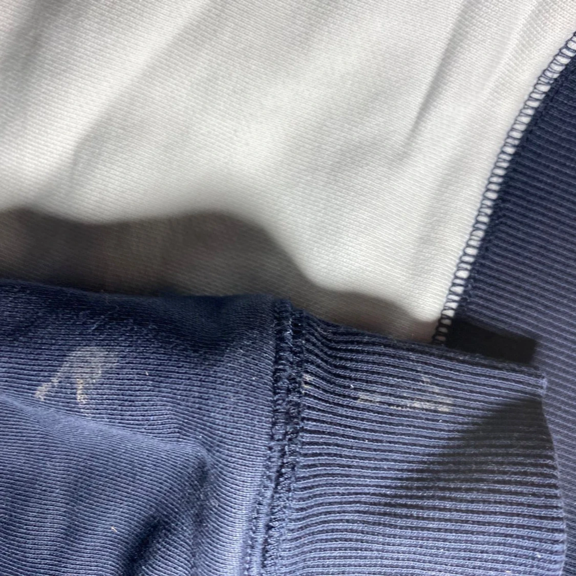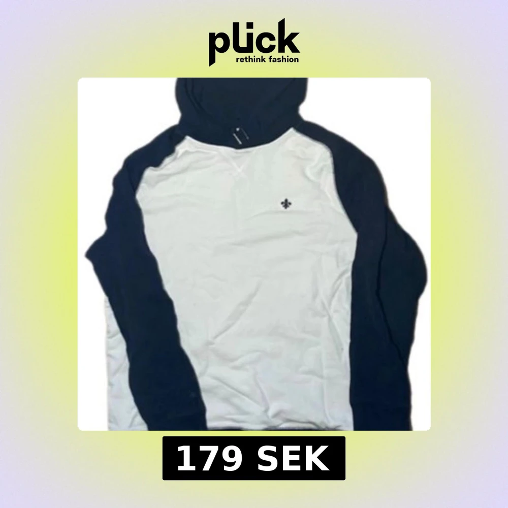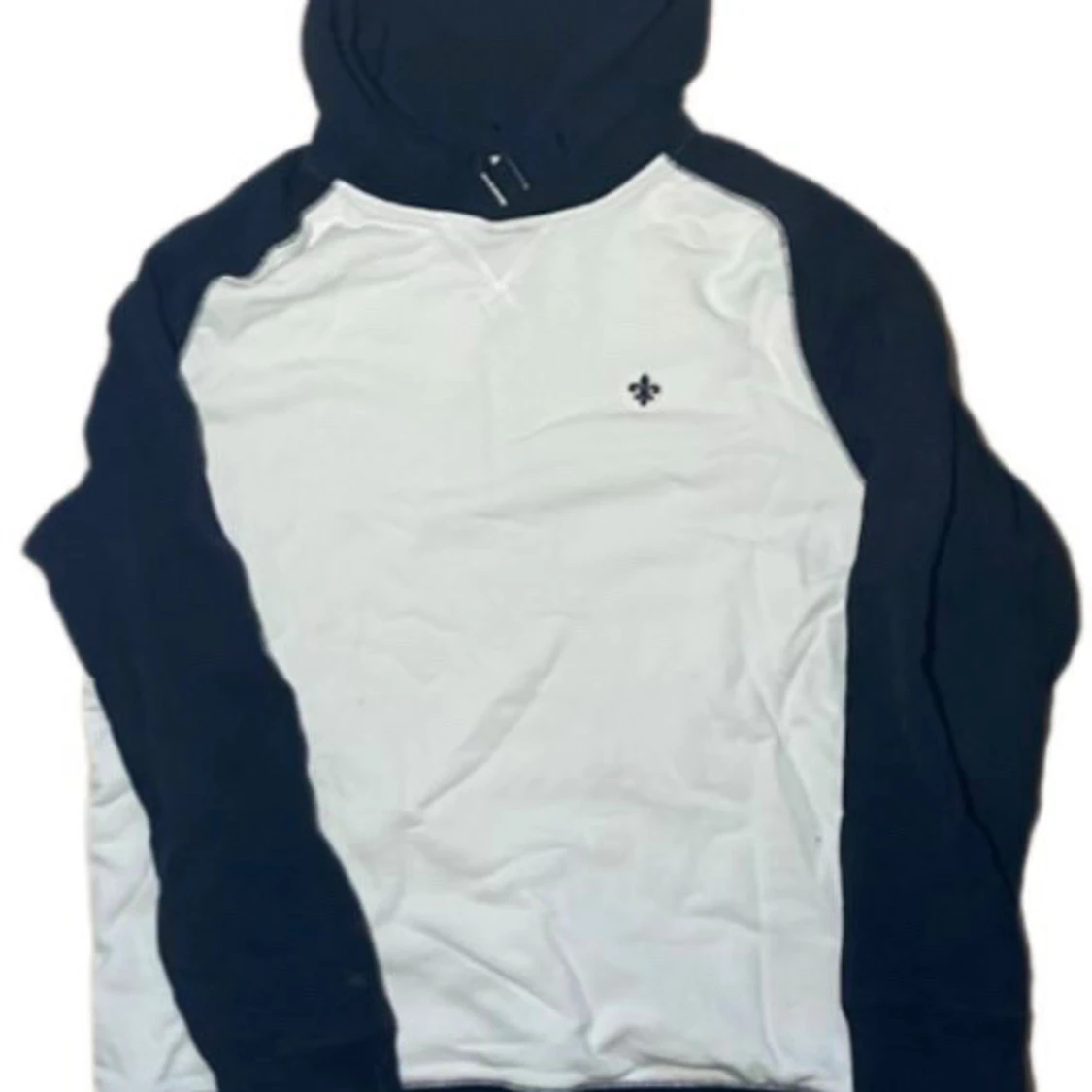 Snygg hoodie med vit kropp och marinblå ärmar samt huva. Liten svart emblem på bröstet ger en clean look. Tröjan har långa ärmar och ribbade muddar. Perfekt för chill dagar och streetstyle. Materialet känns mjukt och skönt mot huden.