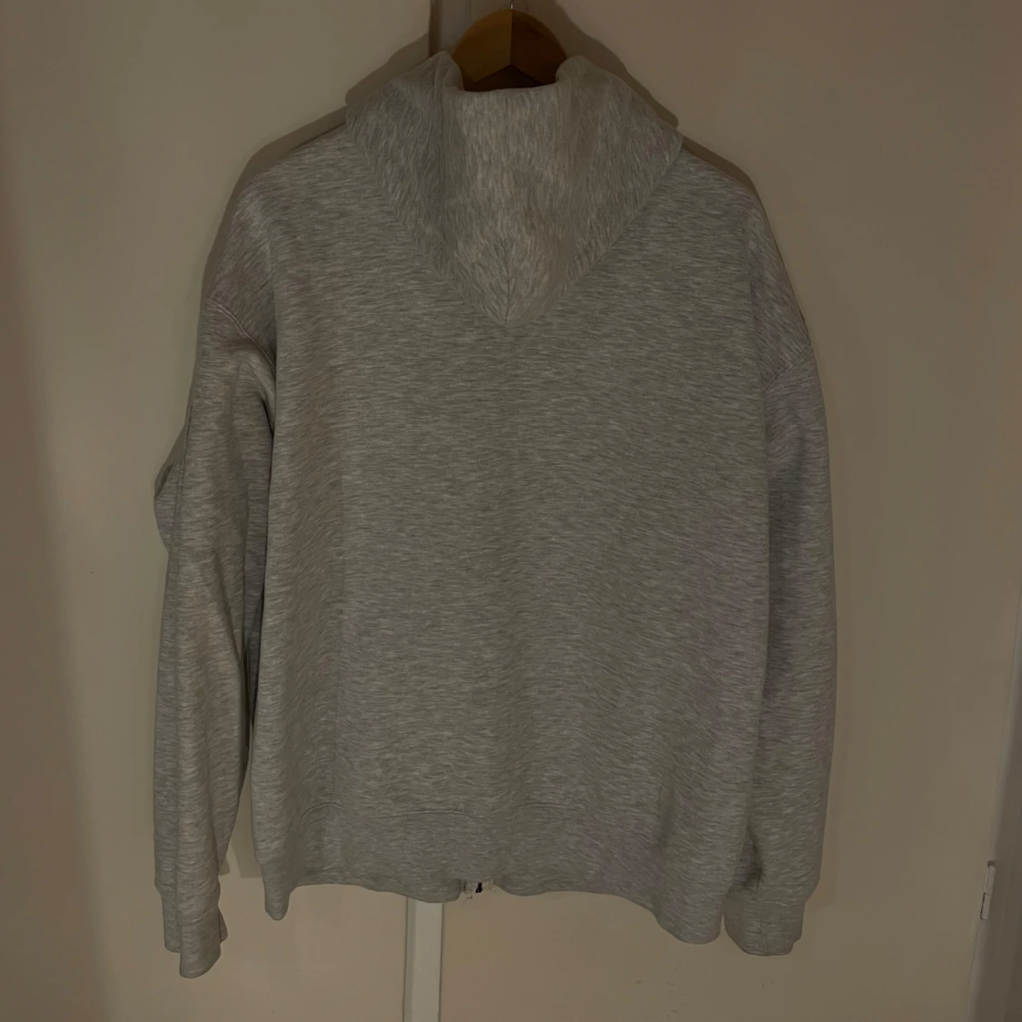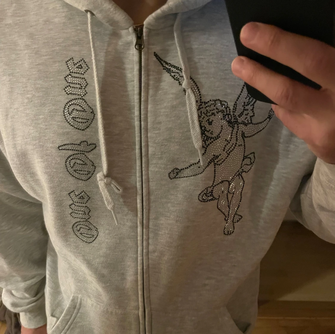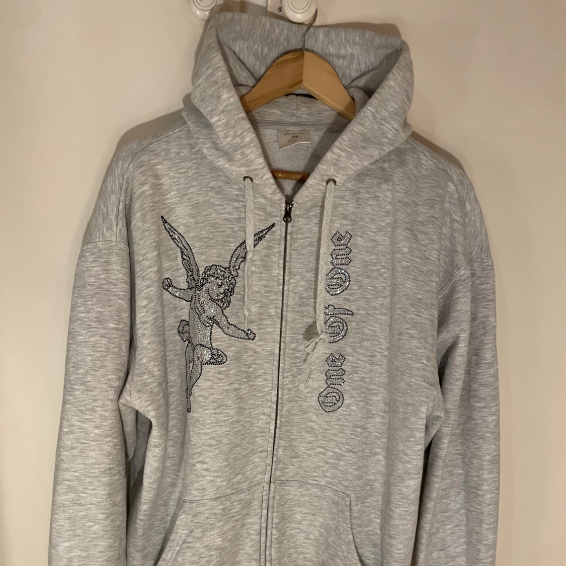 Säljer en grå hoodie från One of One med dragkedja och ett coolt ängelmotiv på bröstet. Hoodien har en avslappnad passform och är perfekt för en casual look. Enbart använd 2-3 gånger, perfekt skick!