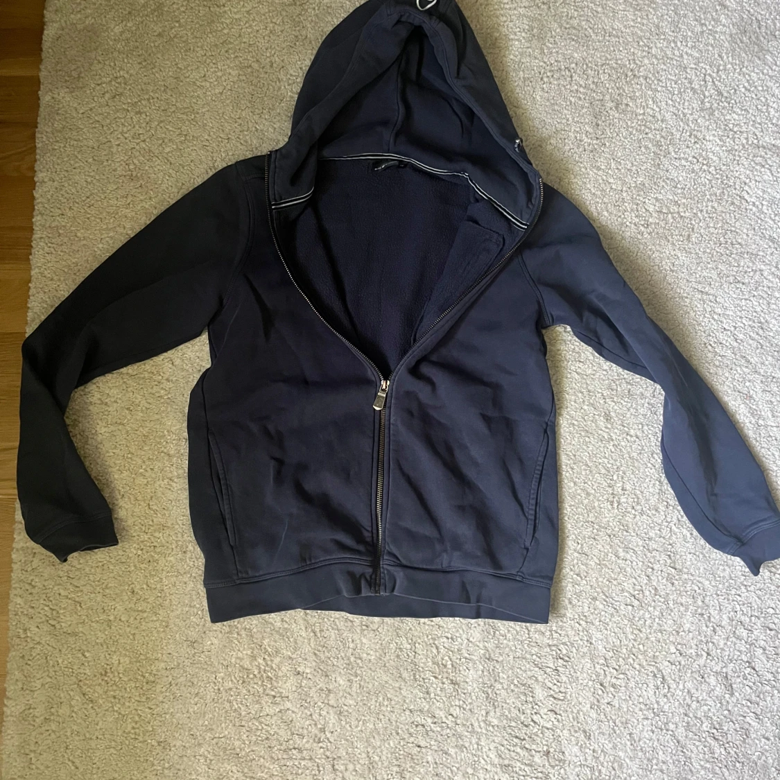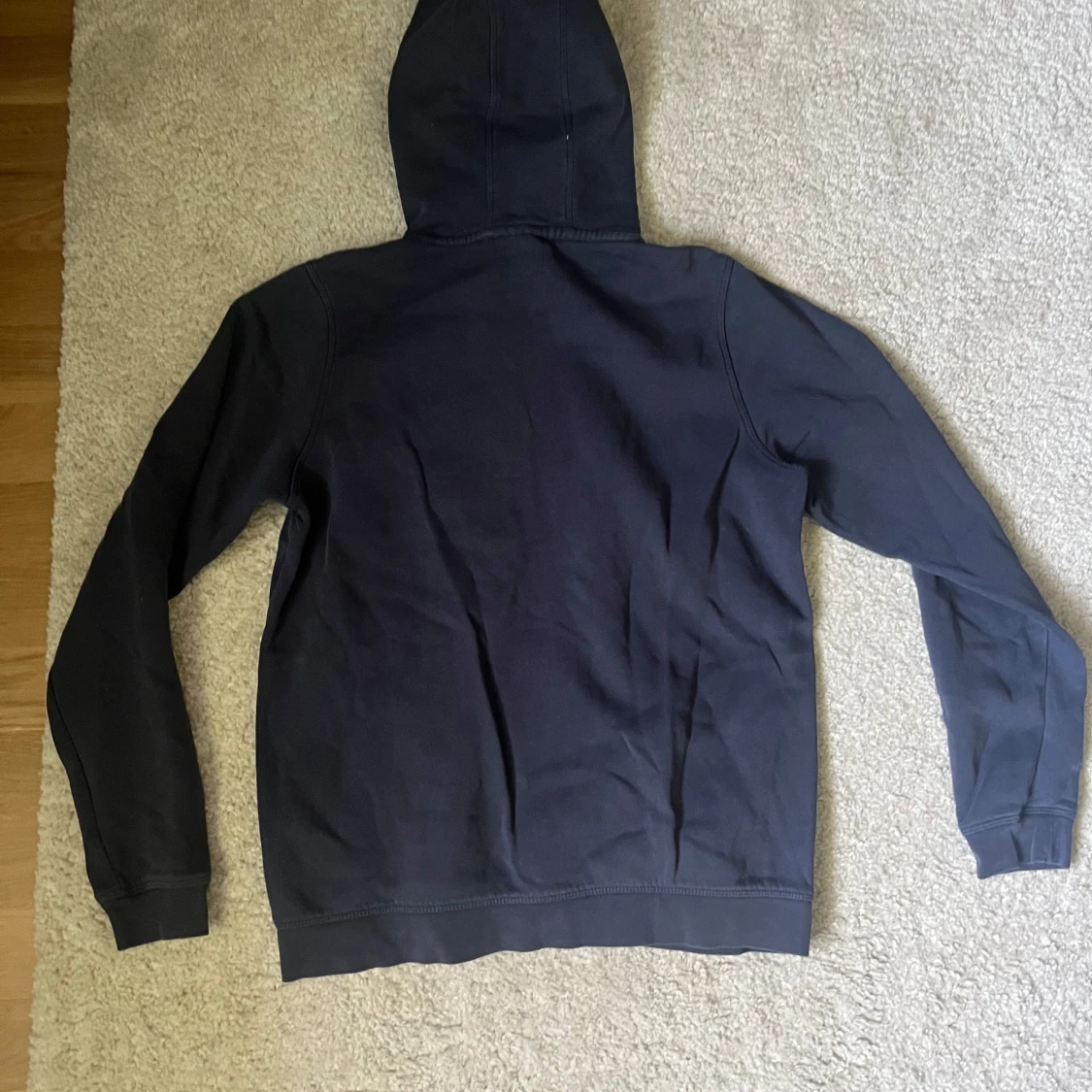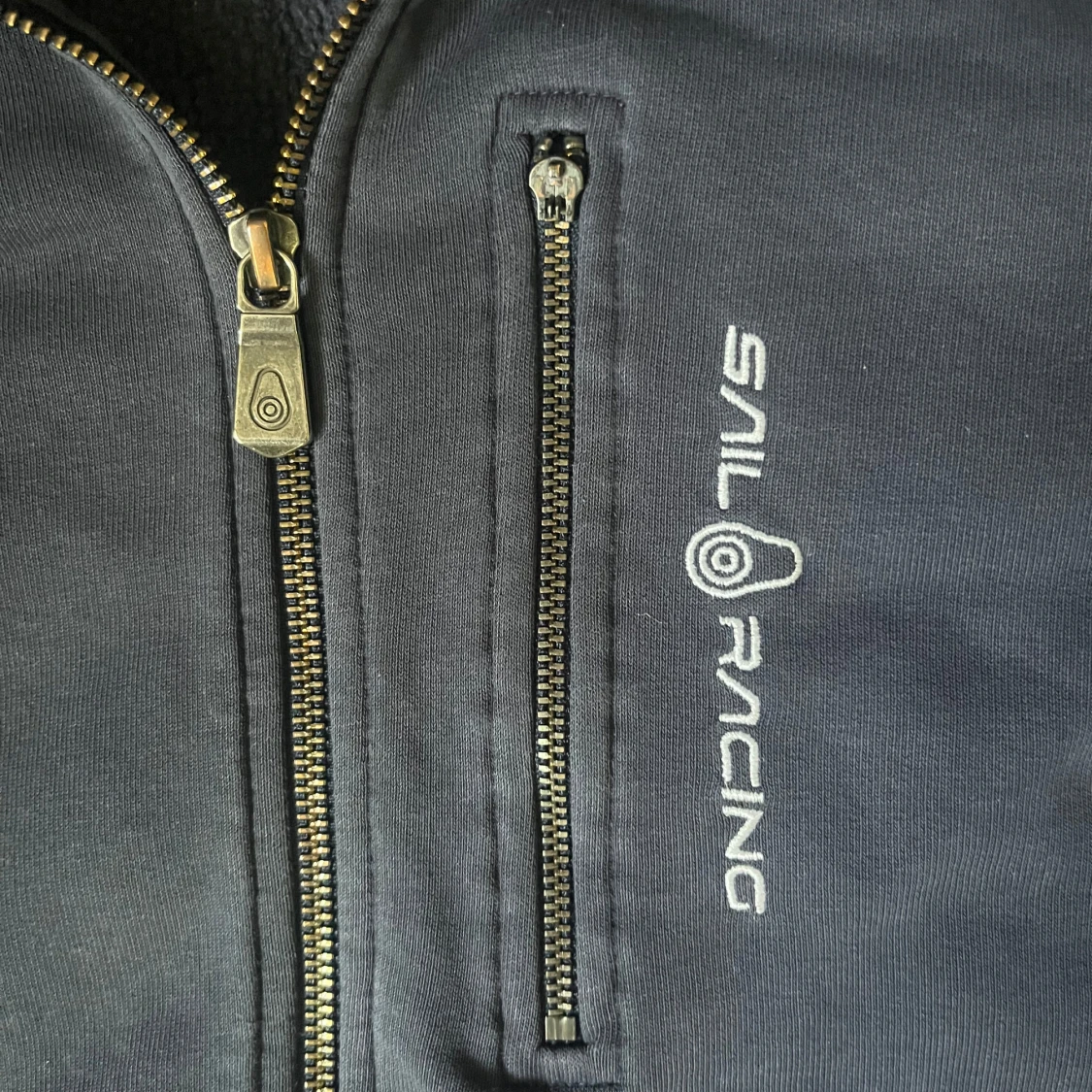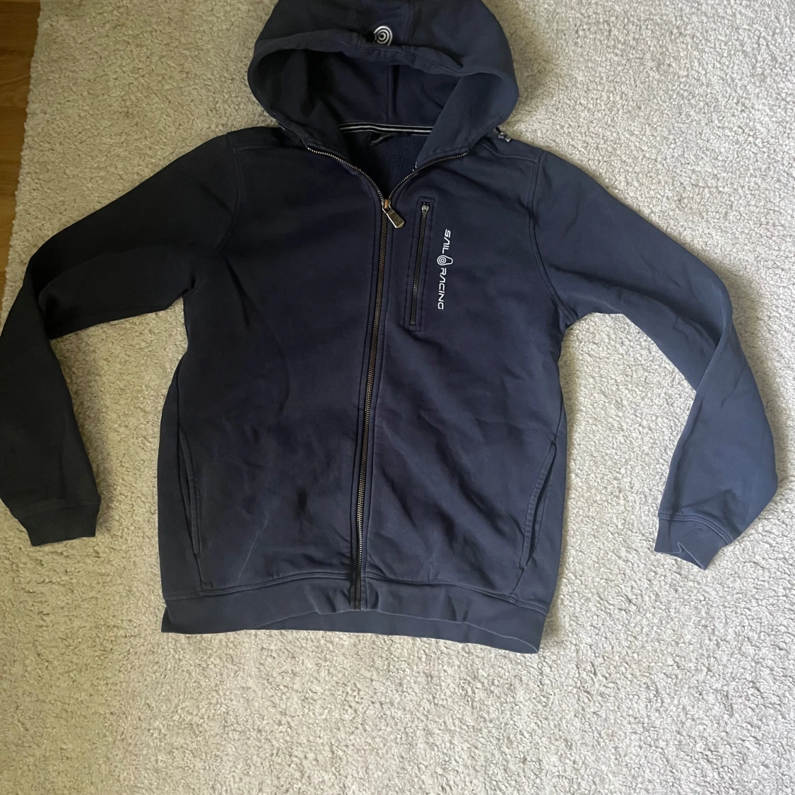 Mörkblå hoodie från Sail Racing med dragkedja framtill och en bröstficka med dragkedja. Tröjan har huva och broderad logga på bröstet. Perfekt för kyliga dagar och enkel att matcha med andra plagg. Kedjan har gått av på lilla fickan. Annars Nytt skick. Barnstorlek 170 motsvarar XS och KANSKE S i vuxen storlek.