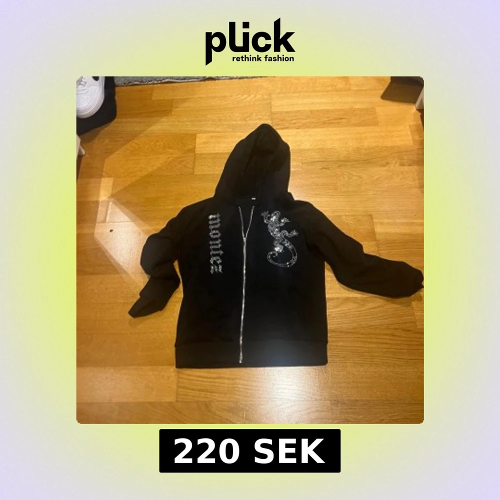 Säljer en svart hoodie med dragkedja och en glittrig ödla på framsidan. Texten 'montez' i glittriga bokstäver längs ena sidan. Perfekt för en unik och stilren look.