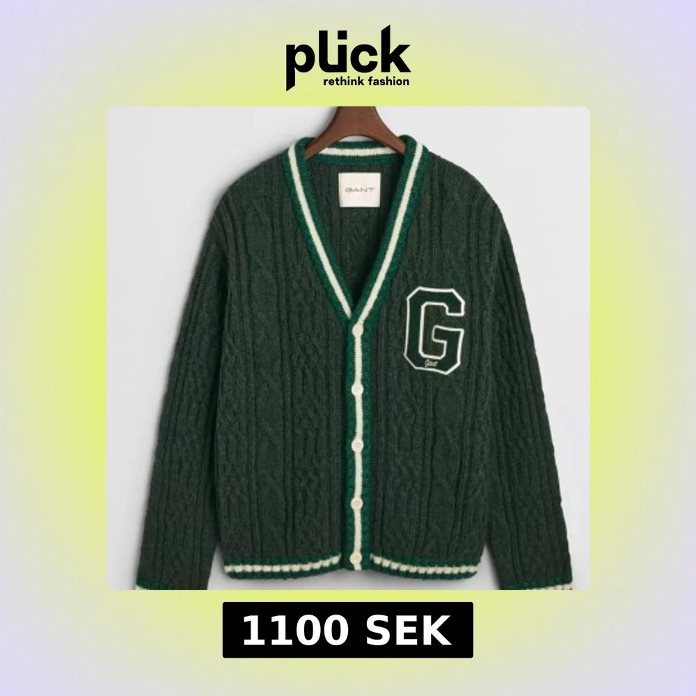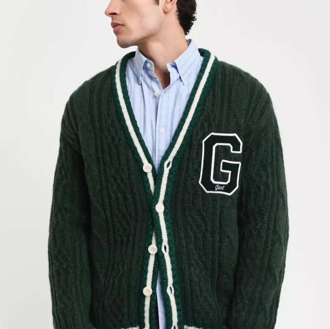Mörkgrön stickad kofta från Gant med vita och gröna ränder längs knäppningen och nederkanten. Stort G-broderi på bröstet, v-ringad och med vita knappar. Perfekt för lager-på-lager och snygg till skjorta. Helt oanvänd och med etiketter kvar Inköpt på johnells och kvitto finns. Nypris 2699kr