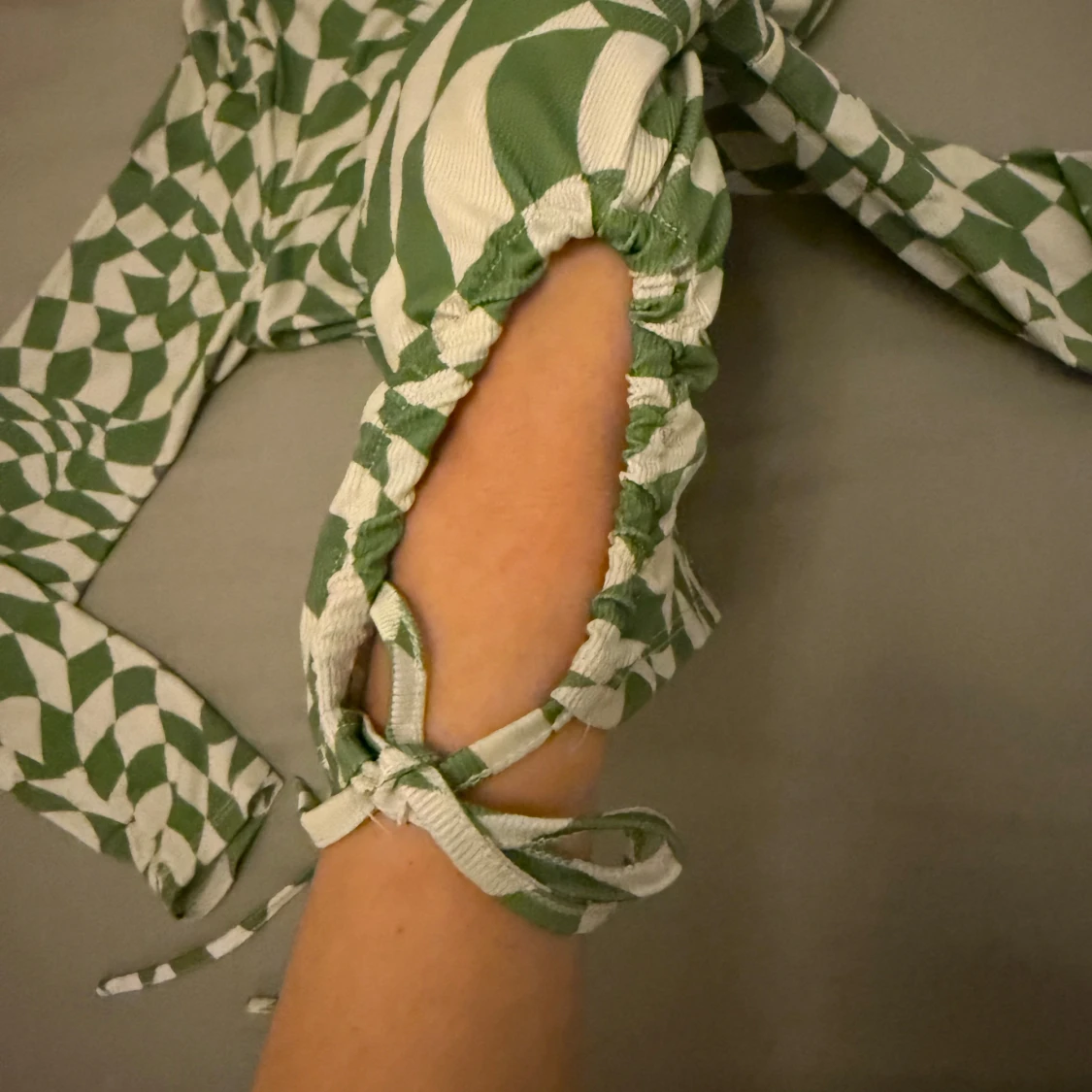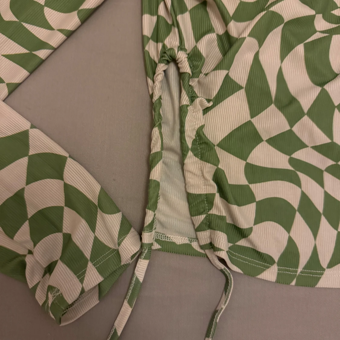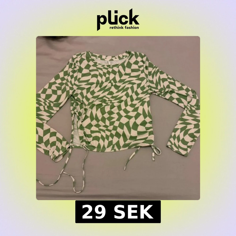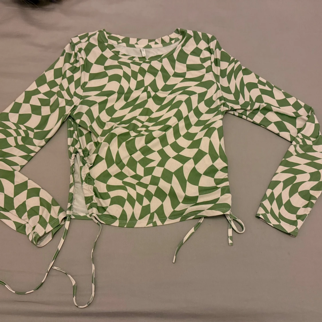 Säljer en cool grön och vit topp med ett unikt mönster. Toppen har långa ärmar och snörning på sidorna för en justerbar passform. Perfekt för att ge din outfit en extra touch!